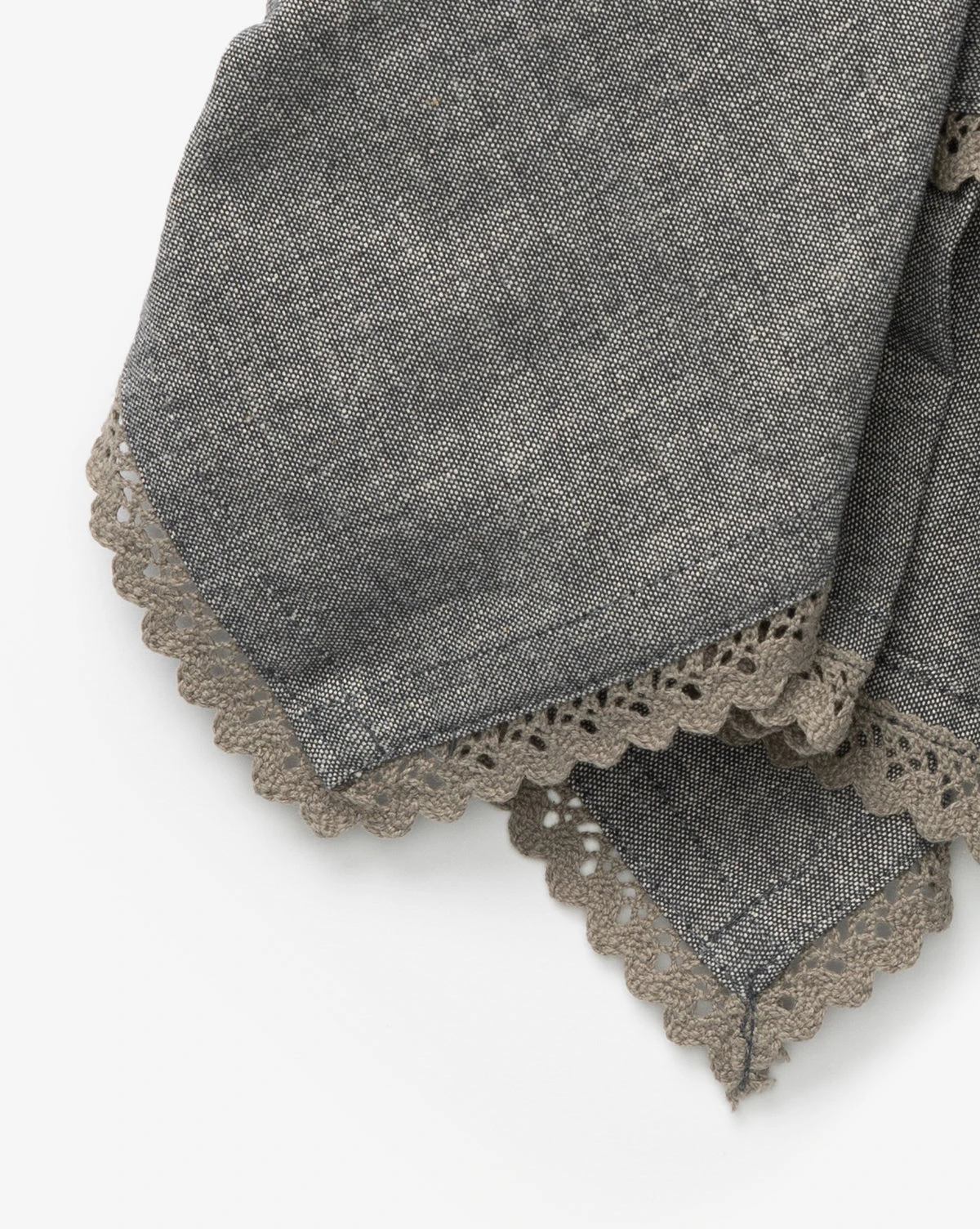 With a charcoal hue, and tonal lace-detailed edge, this set of napkins makes entertaining or everyday dining a breeze. Let its neutral coloring add an extra layer of dimension to your tablescape, whether you’re dining indoors or out.