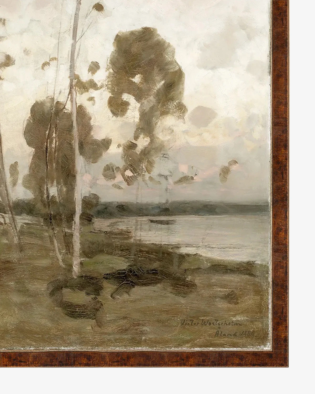 Thick brush strokes and a cool palette bring a serene landscape scene to life in Lakeside at Dusk. The museum-quality piece is a giclee print within a distressed gray walnut frame. With a mix of green and neutral tones, the piece adds intriguing beauty to your wall treatments or vignettes. Â