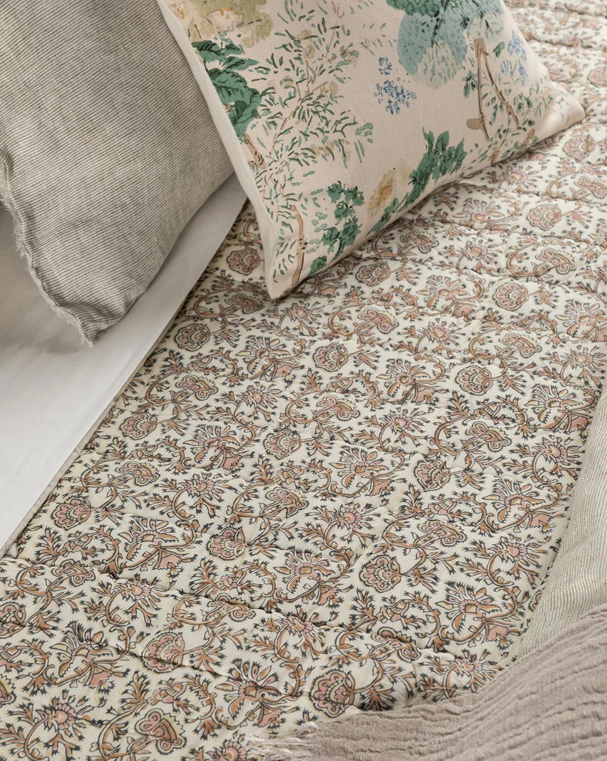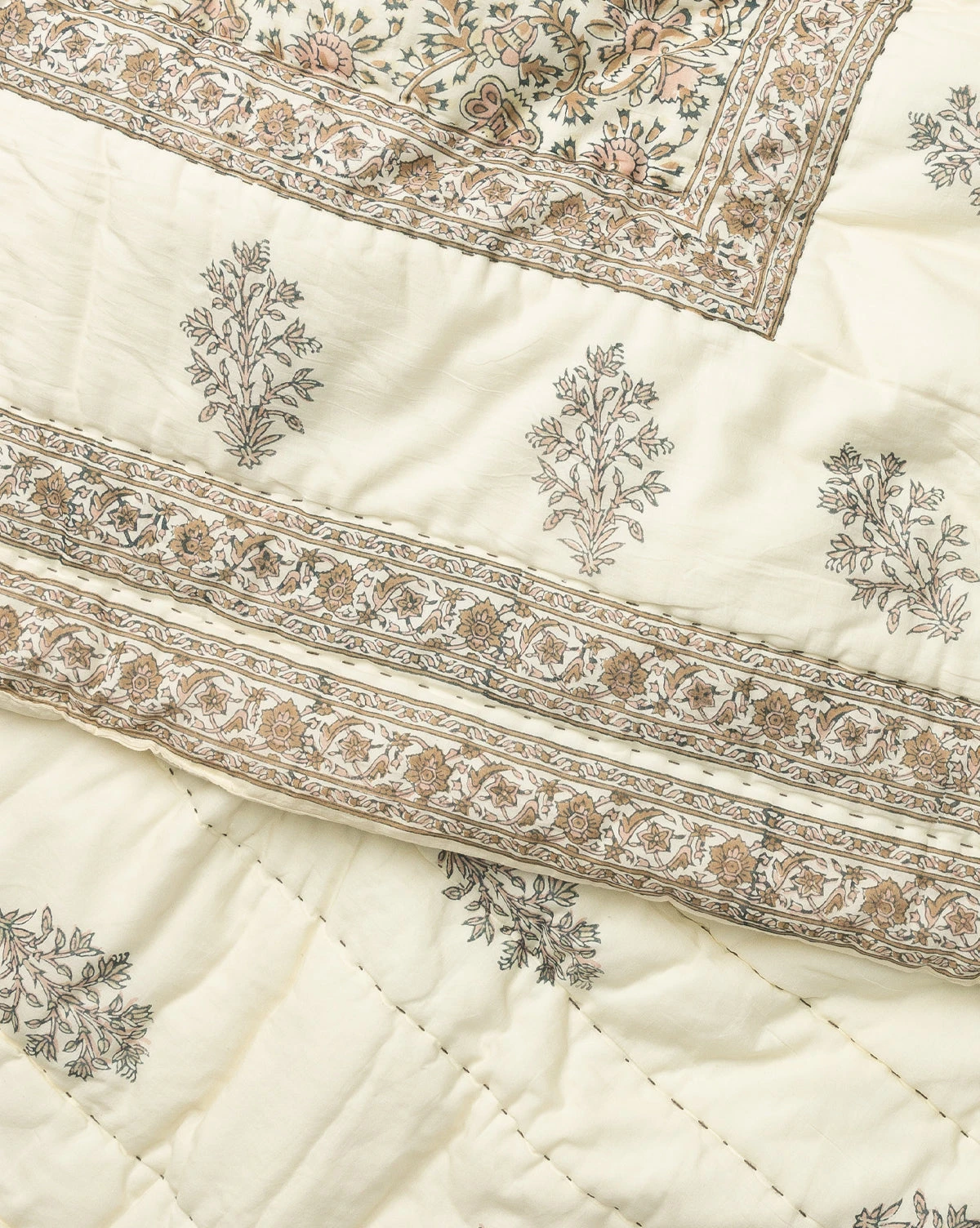 The Leander Quilt is a romantic addition to bedding, featuring an intricate block print design. Made from 100% cotton, the intricate and warm motif lends visual texture and an elegant feel to layer with your bedding. This block print quilt speaks to its artisanship in every detail.
