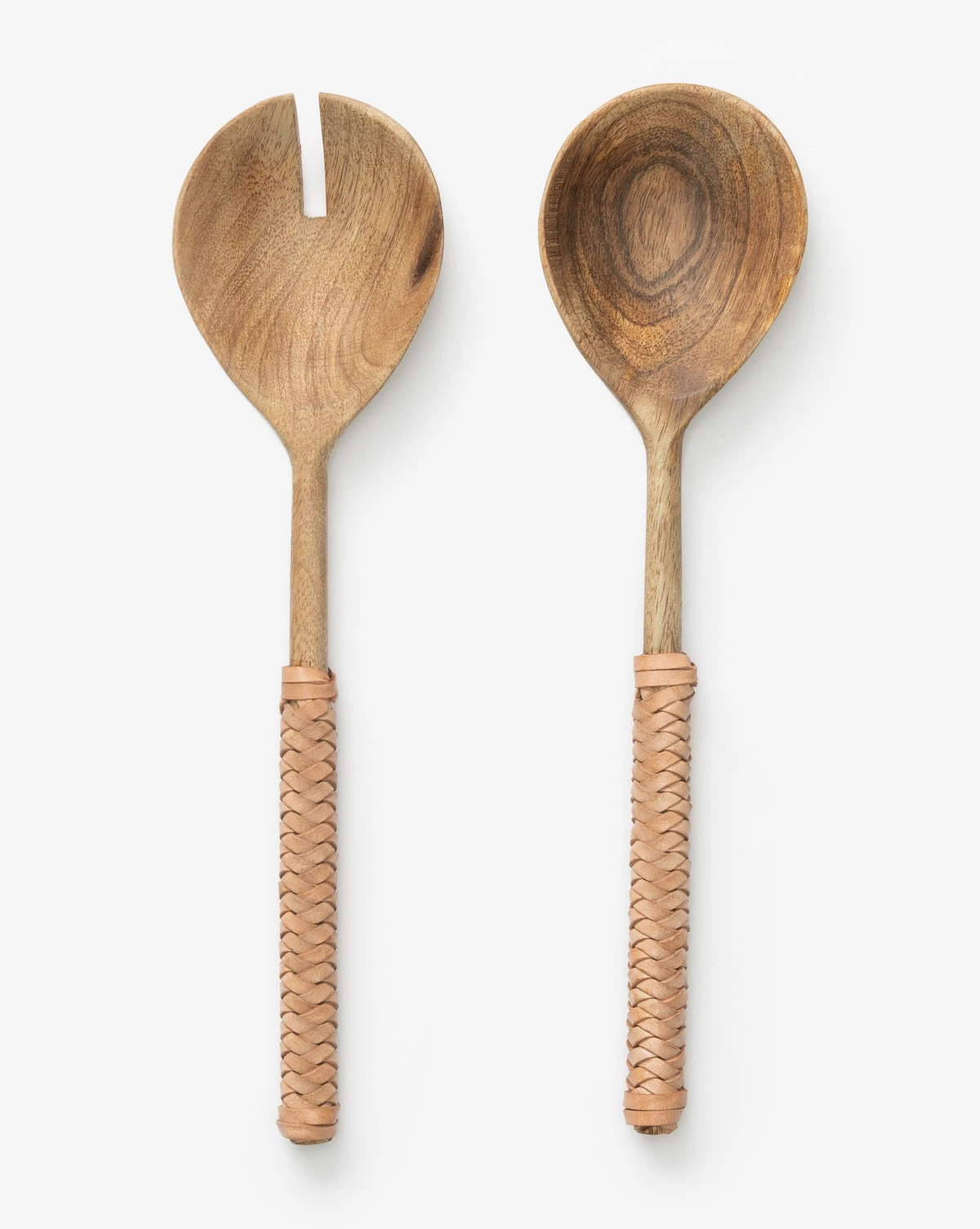 Organic and sophisticated, the Leather Woven Handle Salad Servers instantly elevate your everyday dining experience. From the dark hued wood, to the light leather handles, these salad servers will be the talk of your party!