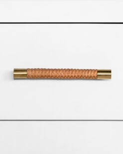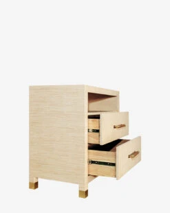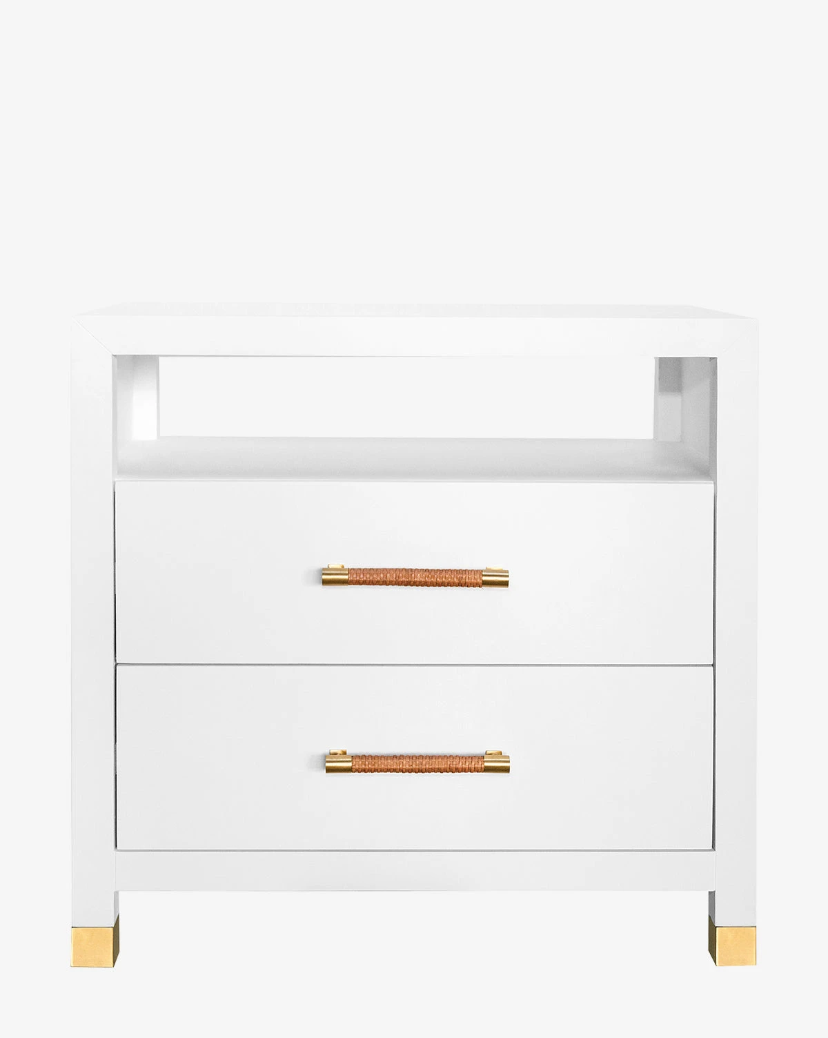Simple yet elevated, the Leonardo Nightstand features stunning details. The two drawers are complete with rattan wrapped handles, complementing its metallic details and straightforward design. Finished in either natural grasscloth or matte white, the wood frame holds spacious drawers for functional storage.