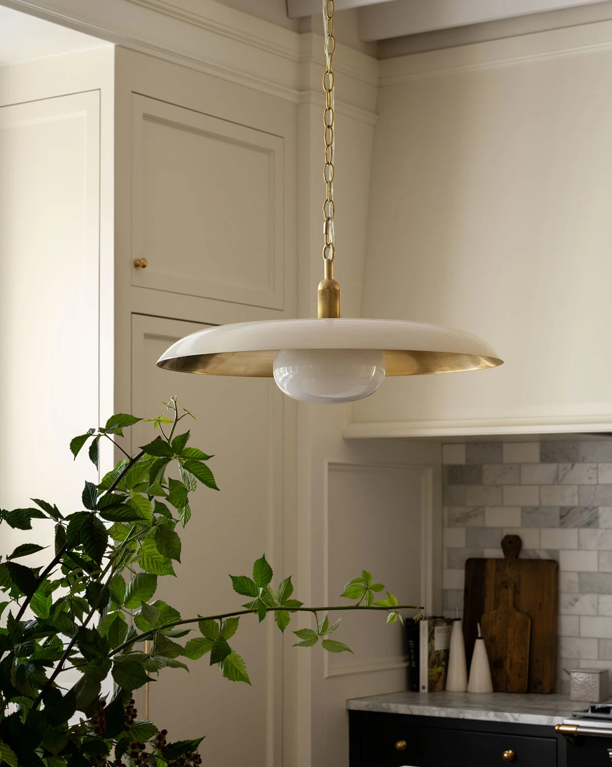 In a simple palette, the thoughtful mix of materials in our Letterly Pendant gives it a unique beauty. The opal glass shade has a white finish on the exterior and a brass finish on the interior to complement the delicately designed brass chain.