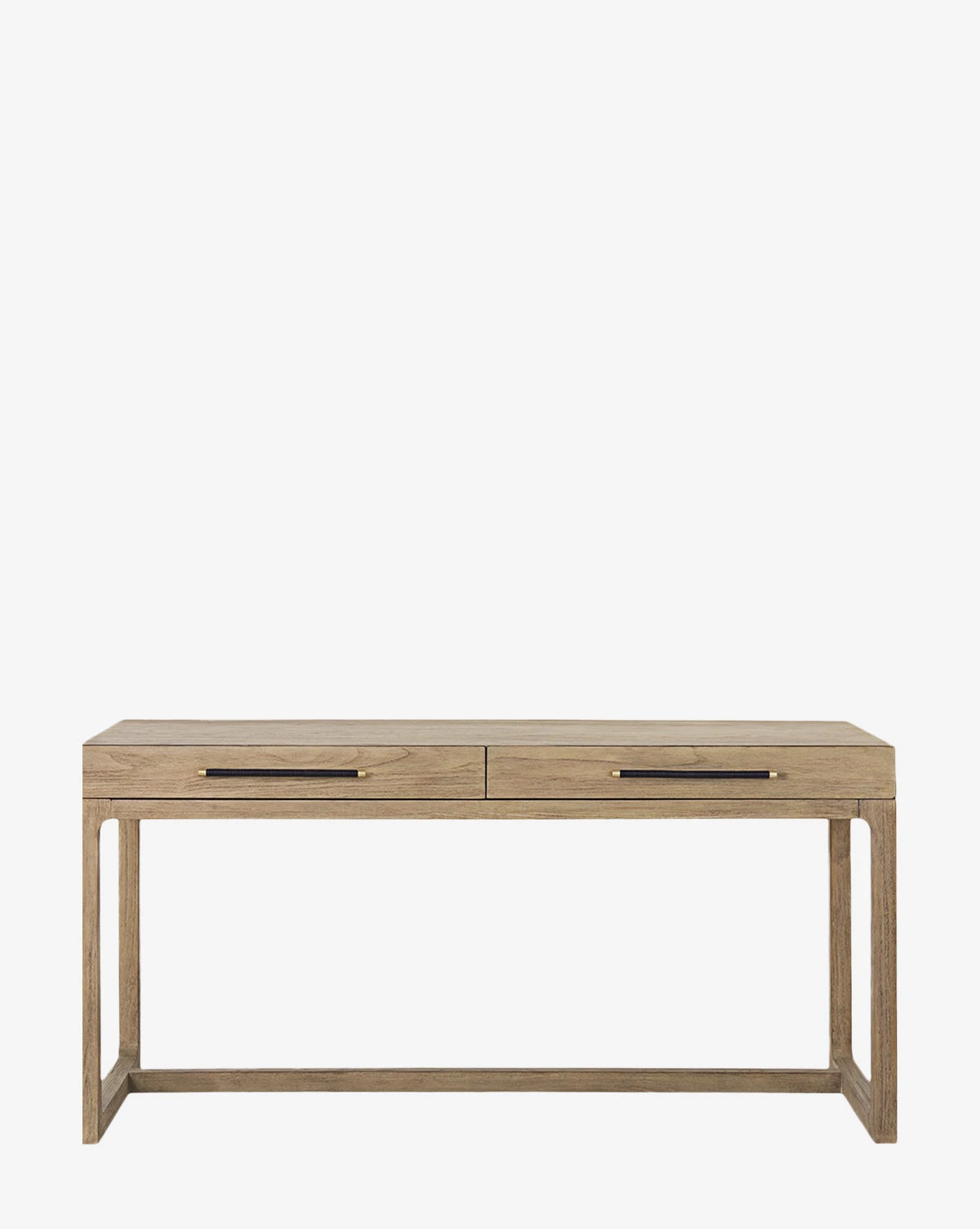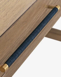 The sophisticated style of the Linton Desk is both modern and chic. Its direct, streamlined silhouette is accentuated by the detailed, intricate hardware. The handles are elongated, wrapped in a rich brown rattan with brass accents, adding a contemporary touch to this beautiful desk.