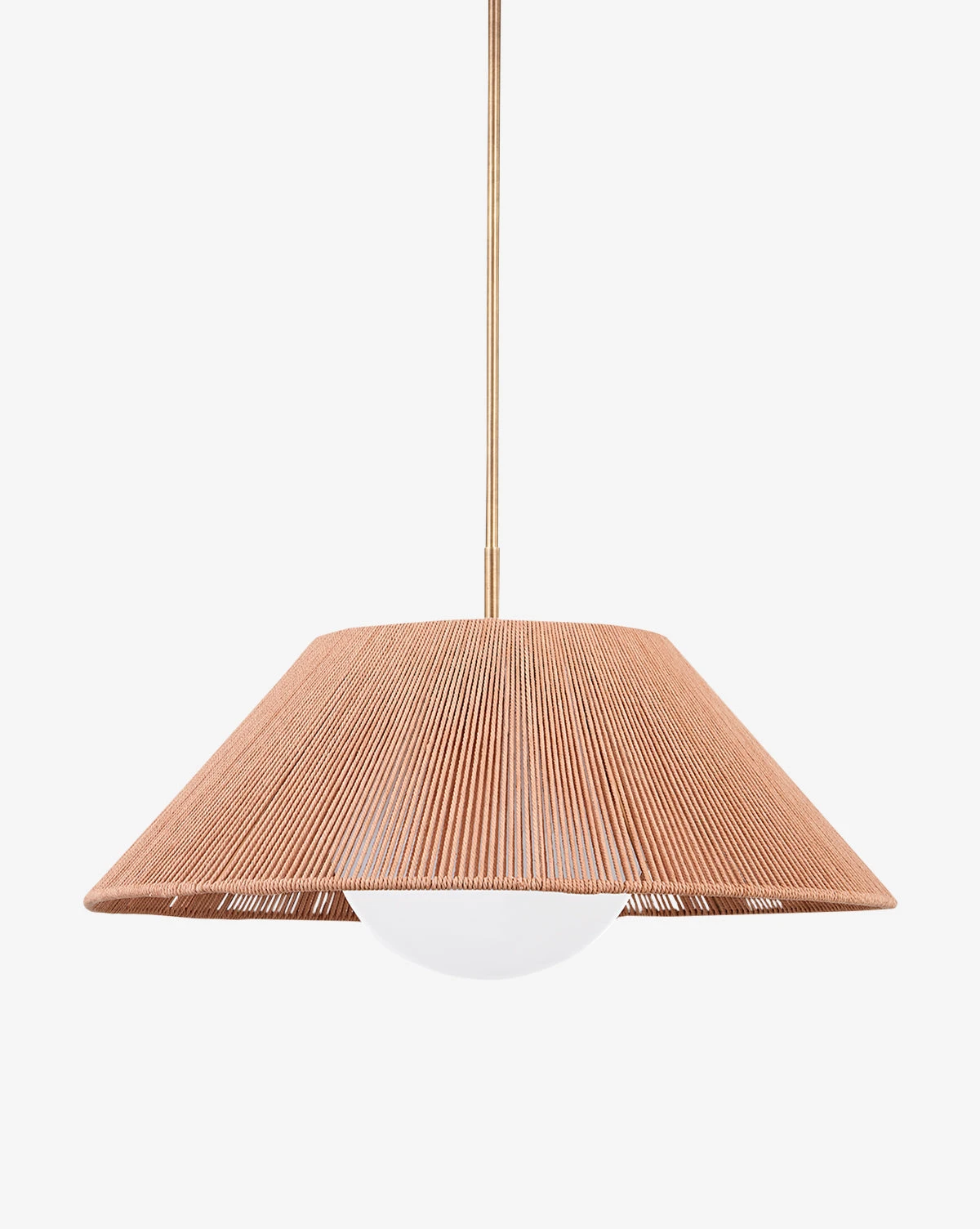 With a warm and airy feel, the Libson Pendant brings an elegant and organic element to your decor. The intricate shade is made from wrapped cotton string in a natural hue, complemented by a patina brass finished rod. When lit, the silhouette of the globe shines through the shade in a soft and inviting way.