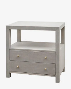 The Louise Nightstand uses diverse storage options to create vignette worthy design. Â Its open shelf, and double drawers allows maximum creativity to display and store your favorite books and collected treasures. Â Its grasscloth woven frame and linen drawers, provide a subtle accent of texture to your designs. Â