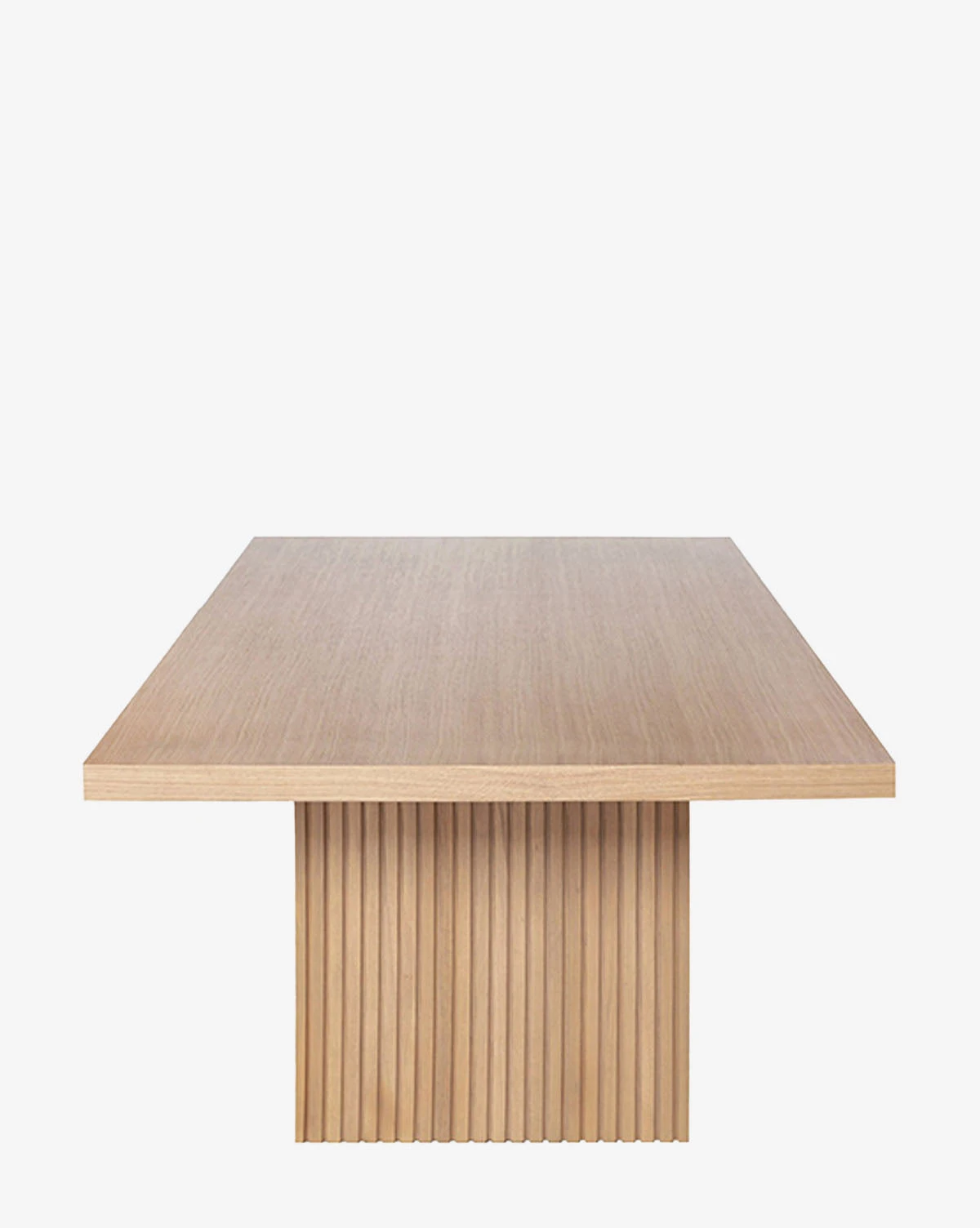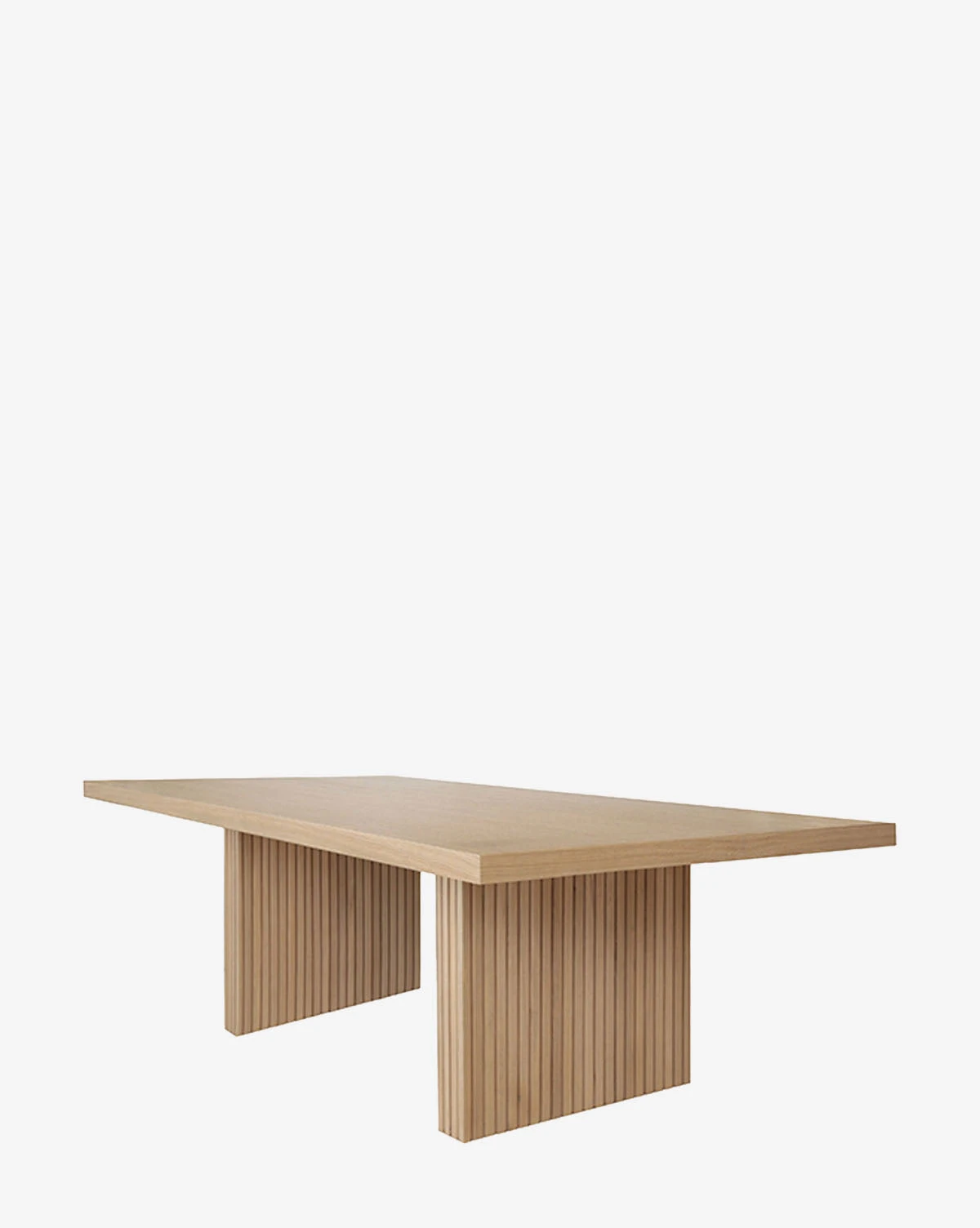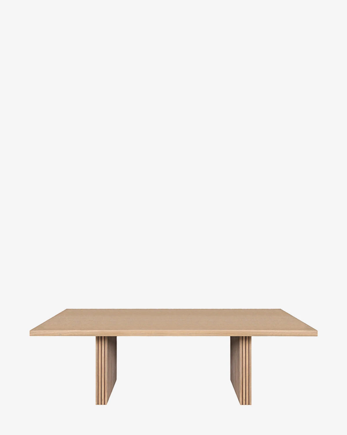 With a modern and geometric design, the Mabel Dining Table is crafted from oak and pine in a natural finish. The wide tabletop rests on two detailed rectangular legs, adding depth and intrigue to your dining room.