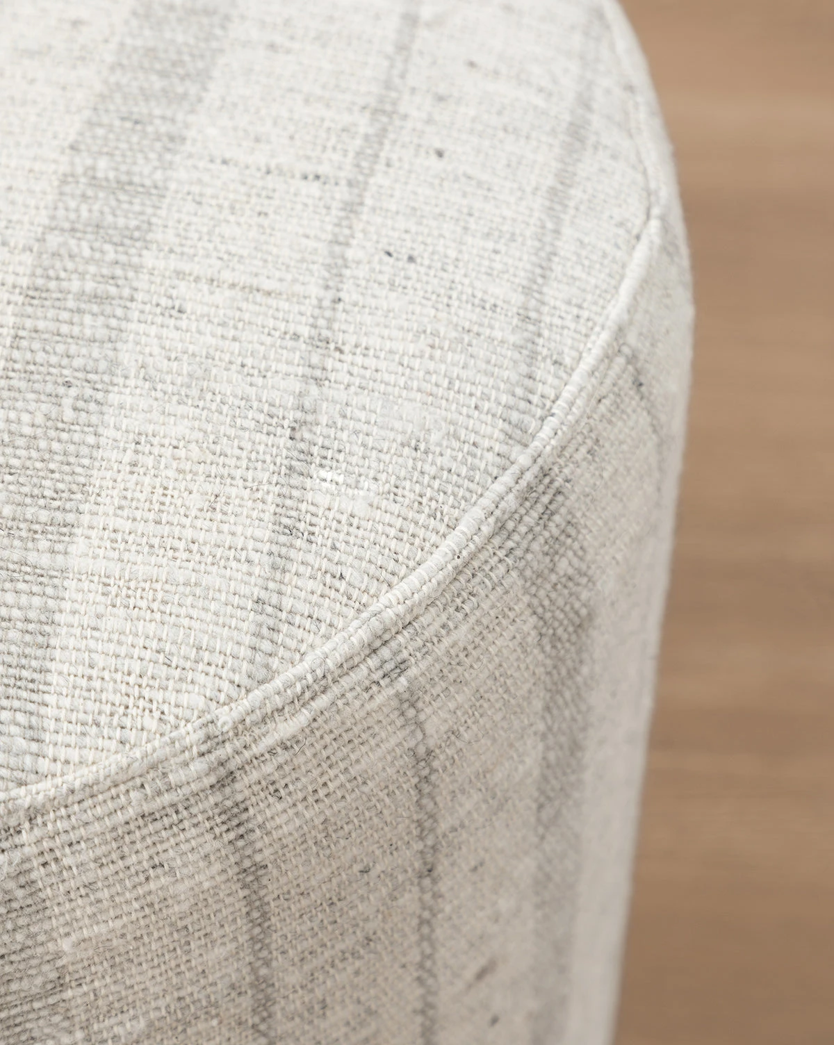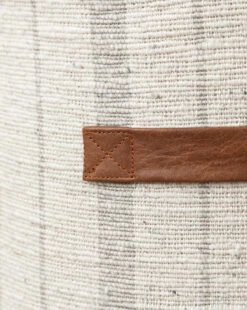 Soft stripes give the McKay Small Round Ottoman a classic style and visual interest. In a palette of muted gray and cream, this simple ottoman gives nod to traditional fabric ottomans while elevating its overall design with thoughtful attention to its craftsmanship. Small leather additions give added detail to the McKay Small Round Ottoman, creating a nuance of mixed textures and styles.