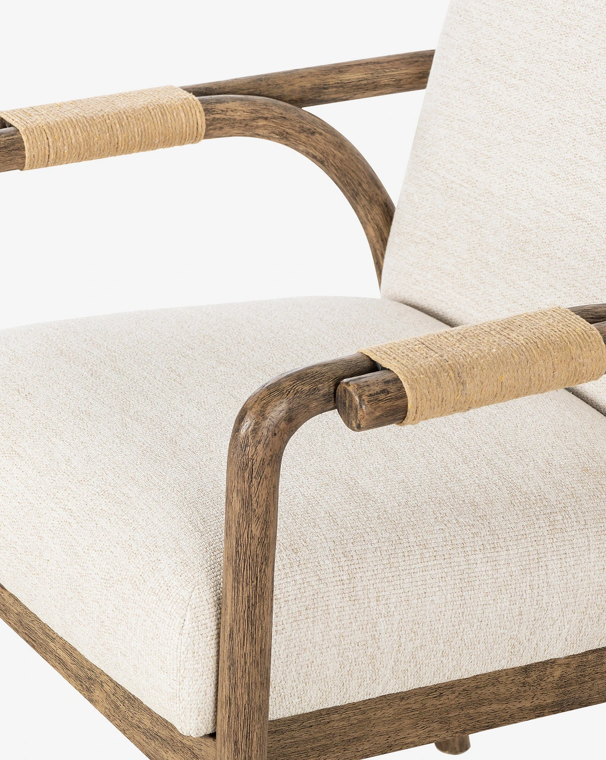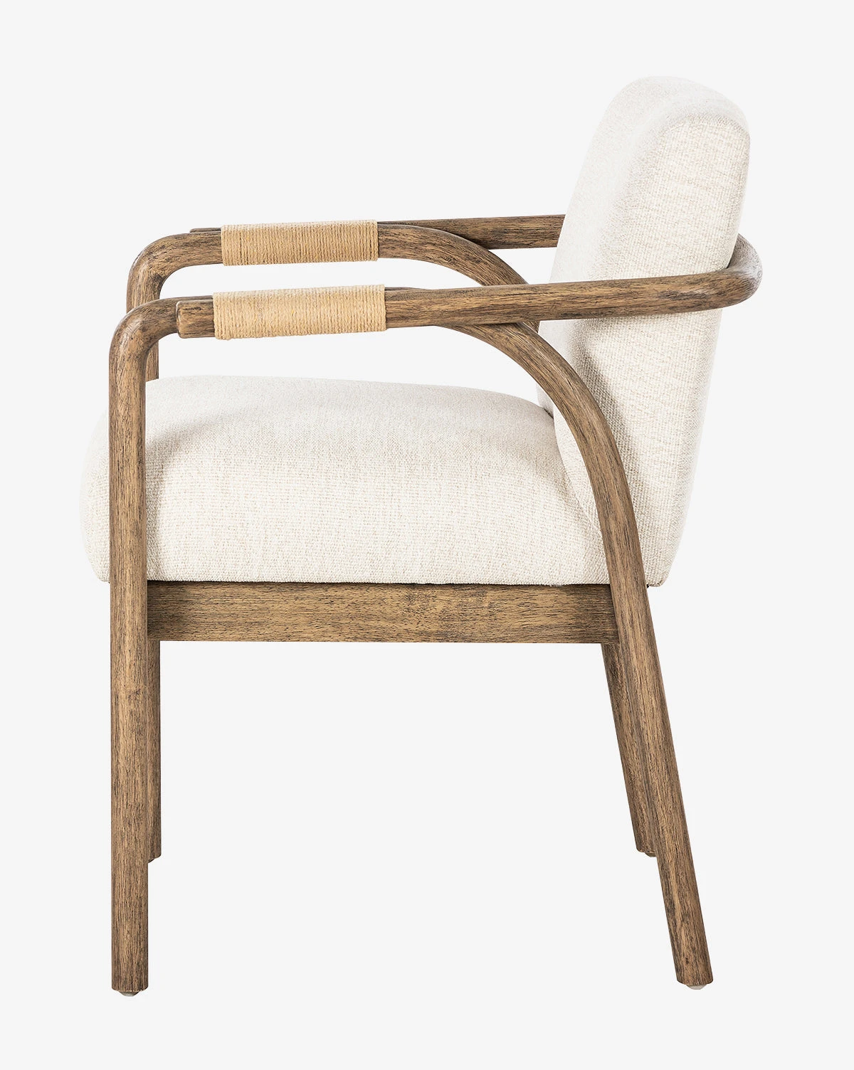 Sophisticated and shapely, the Meira Armchair features a masterful mix of materials. A frame of solid parawood features cotton rope detail on its arms, holding an oat colored upholstered seat. Styled in pairs in your living room, or around your dining room table, this chair elevates your space with a touch of modern elegance.