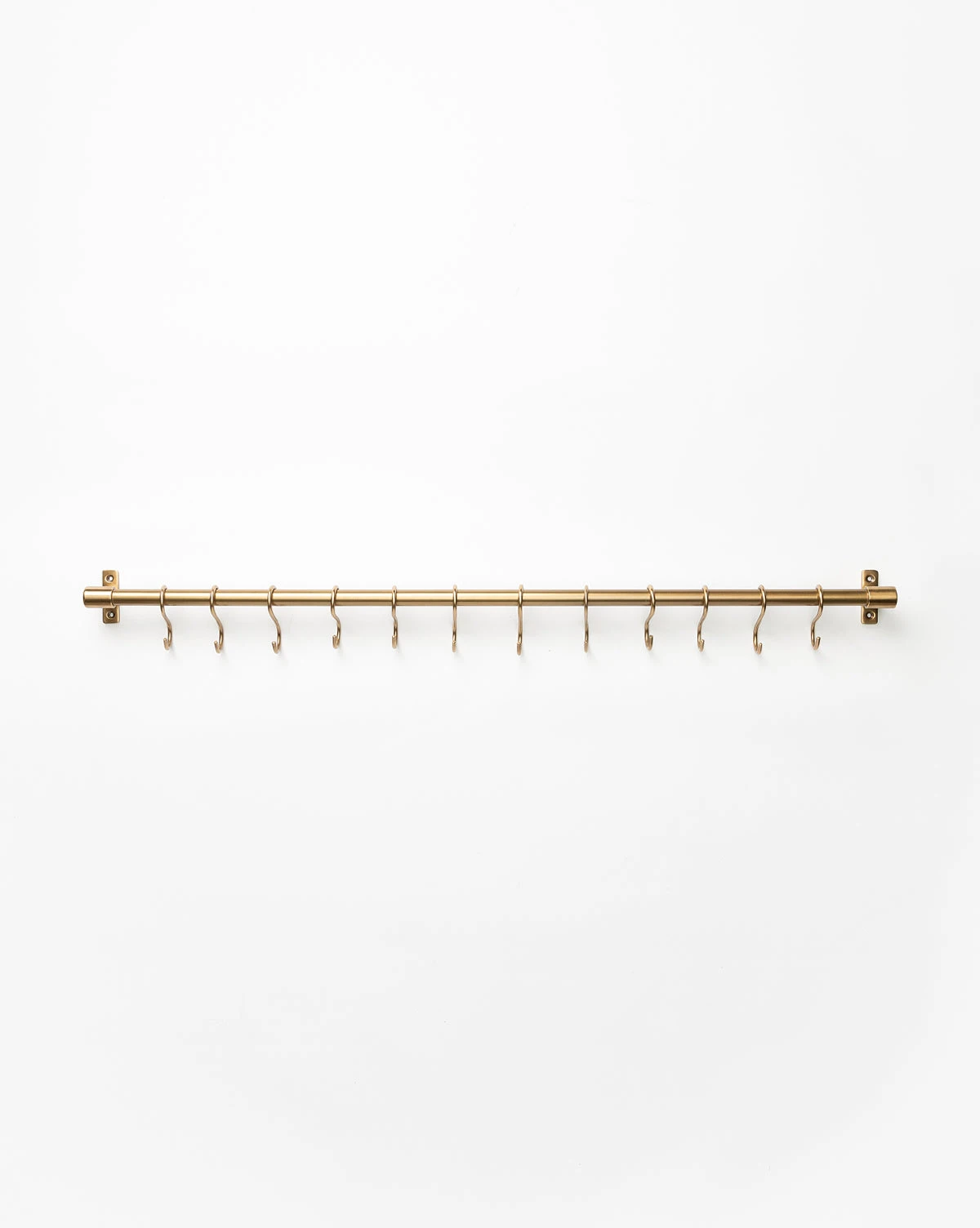 Crafted from iron in a brass finish, the Metal Pot Rack Bar adds a vintage-inspired aesthetic to the kitchen. With hooks that can support small pans or kitchen essentials, this piece brings a touch of warmth to the space.