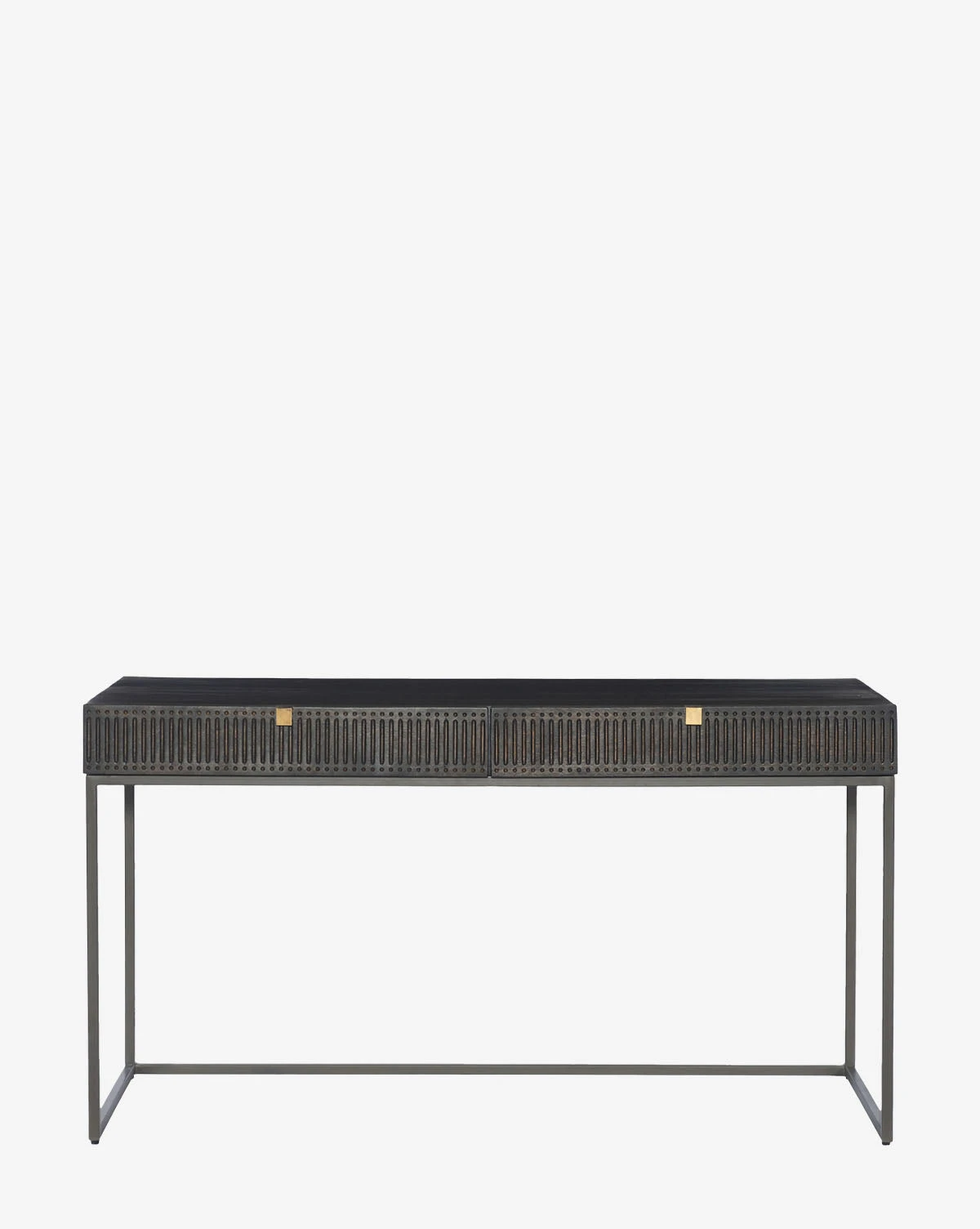 Expertly crafted with an artisan feel, the Nevan Writing Desk features unique linear carvings bringing dimension to its simple form. Two drawers provide just enough room for desk storage, as slim iron legs combine with the textured wood frame for an airy, contemporary look.
