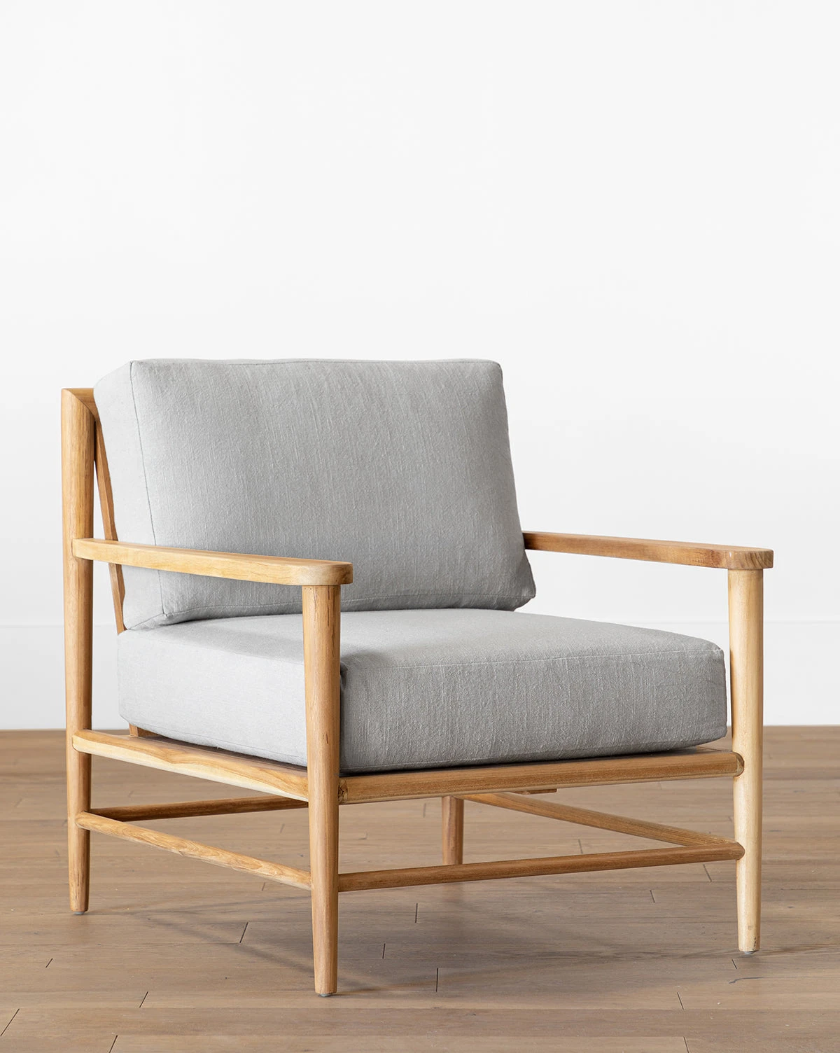 Comfortable and classic, our Beckett Chair is crafted from high-grade teak, for unprecedented durability. Its simple, natural finished frame draws the eye with its intricately caned back detail, while light linen blend cushions provide luxurious comfort. Styled in pairs in your living room, or simply placed in your reading nook, this chair lends a sophisticated, relaxed feel wherever it’s placed.Â