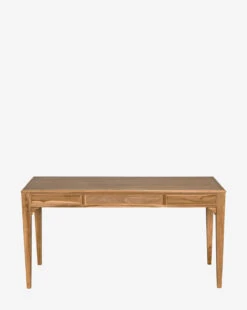 Traditional and versatile, the Elowen Desk blends organic details with sophistication. With antique brass hardware, the desk is crafted from teak in a bleached finish, adding a stately presence to your home office.