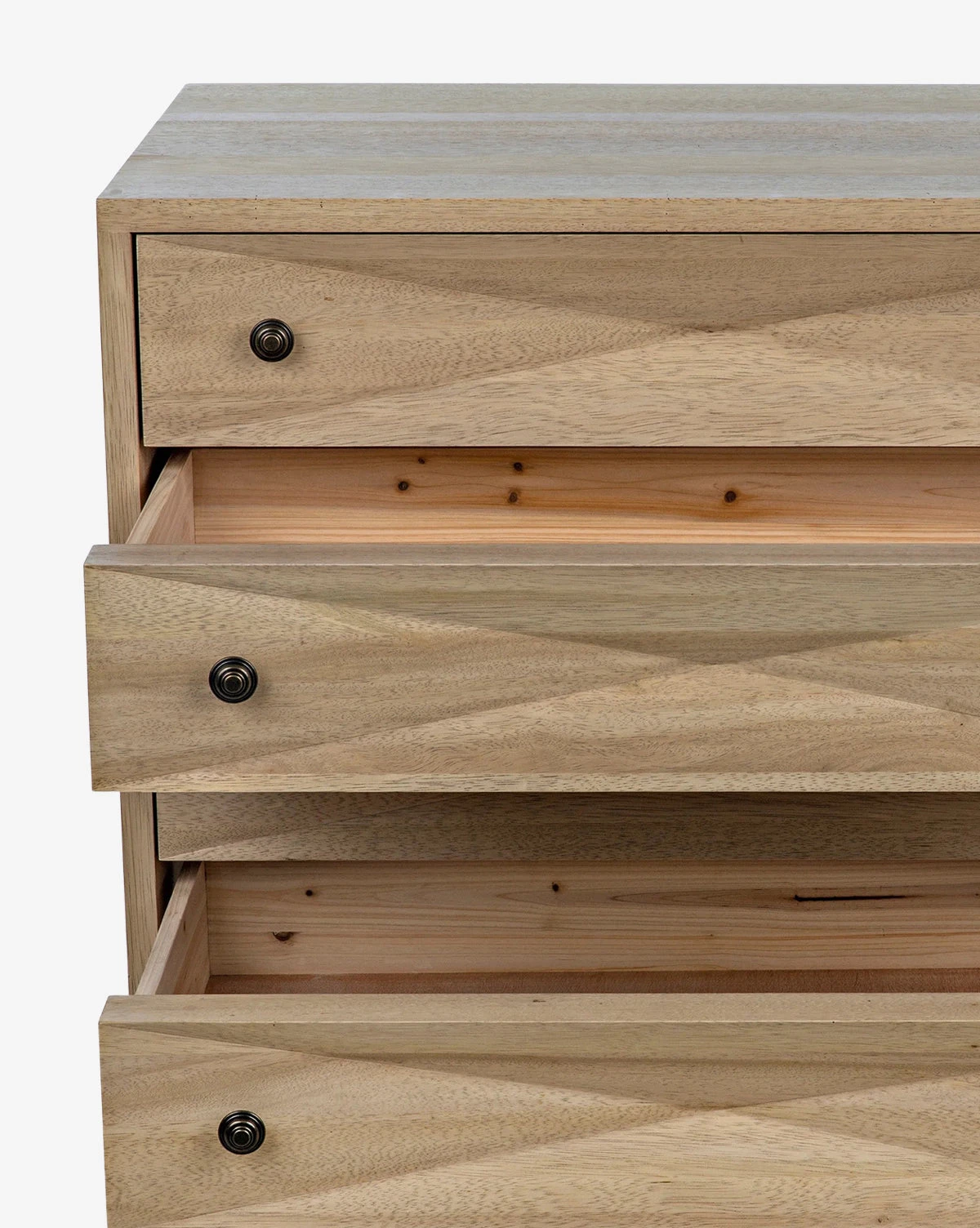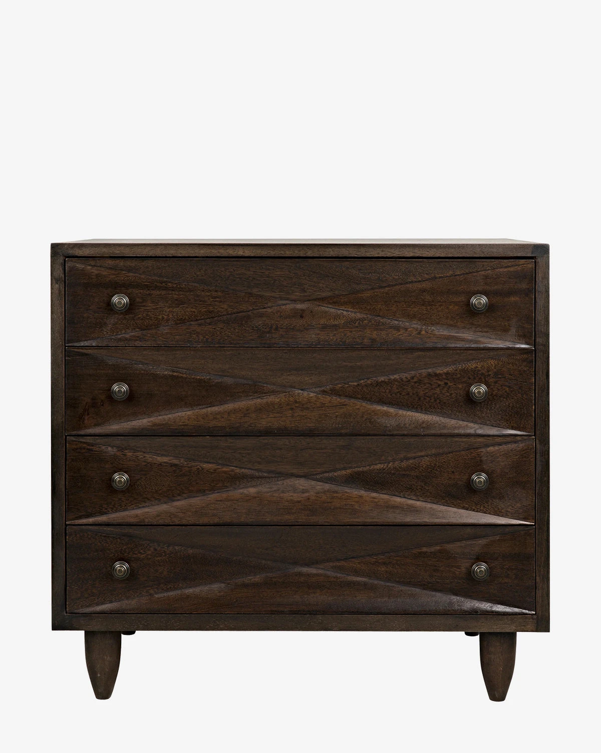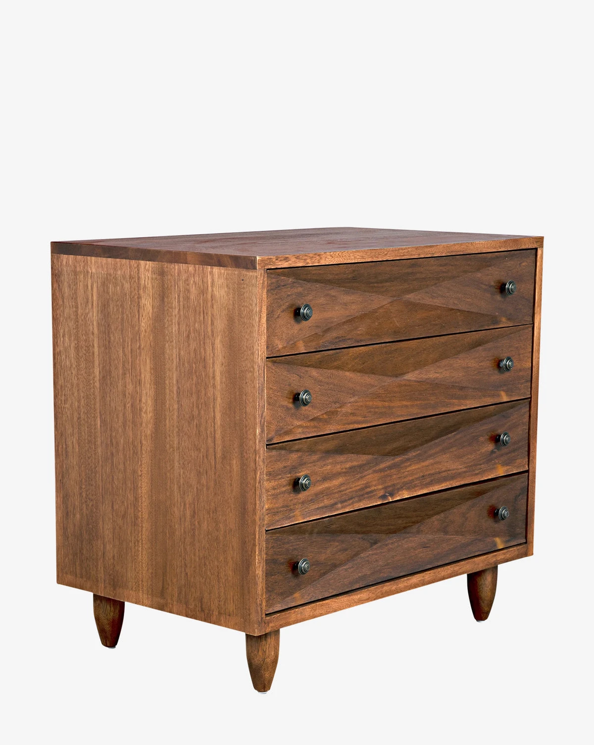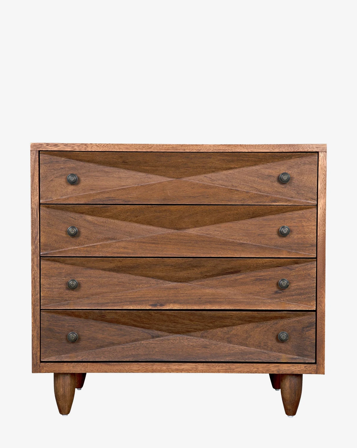The Quinn Diamond chest plays with perspective in its multidimensional face that will immediately create an exciting vignette however it’s styled. Expertly crafted from walnut in three gorgeous shades, this wood was specifically chosen for its organic color and even grain.Â