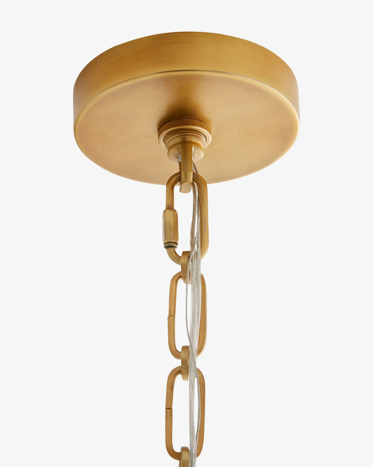 With a conical porcelain shade, the Oakland Pendant brings unique materials to traditional lighting. When illuminated, the pendant highlights the chiseled texture of the shade, adding depth to its clean aesthetic. An antique brass steel link chain brings contrast and warmth to the matte bone porcelain.