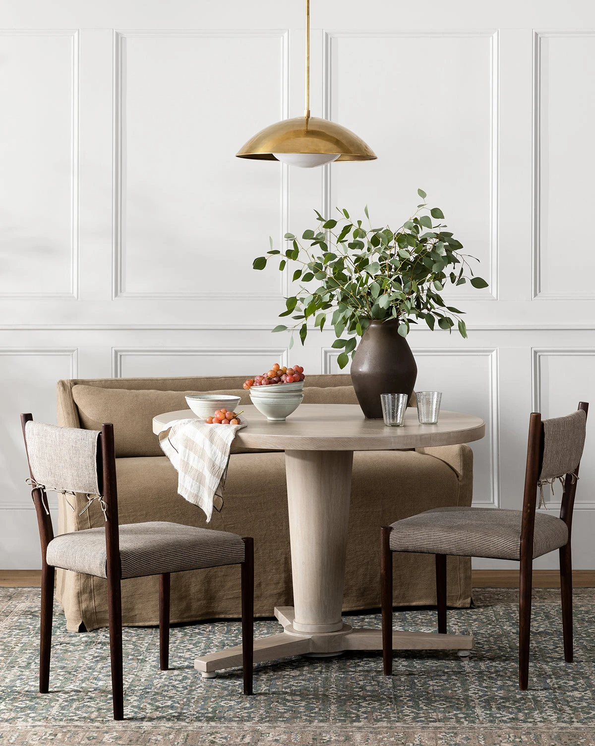 Classic and subtly dramatic, the Olivier Slipcover Dining Bench is upholstered in your choice of beautiful high-quality fabric. Its back fluidly extends into its sloped armrests, creating an elongated look and elegant feel. With cushions filled with a feather and down blend, this dining bench provides both comfort and elevated style.