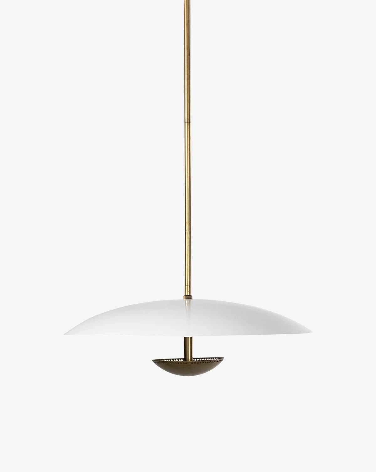 In a simple design, the thoughtful mix of materials in the Oren Pendant gives it a unique beauty and balance. The cream-colored top shade provides a dynamic contrast to the iron bottom shade, available in an antique brass finish.