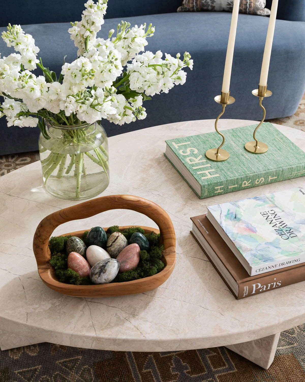 Made from teak wood, the Organic Teak Wood Basket plays with abstract design for an organic and crafted feel. Its large handle and wide bowl-like shape make the basket distinct, giving a thoroughly charming tone to this styling piece.