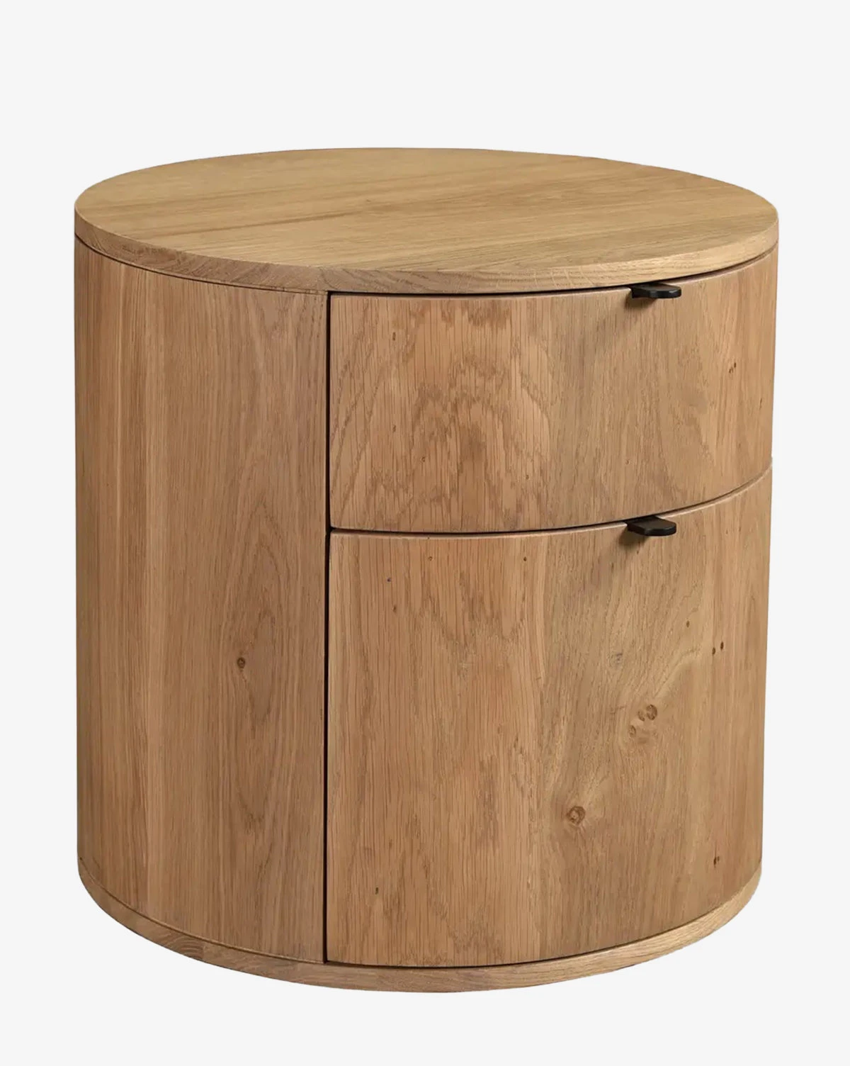 Simple and organic, the Pacey 2-Drawer Nightstand brings a sleek modern feel to a classic nightstand. Crafted from solid oak, the cylindrical structure and black metal hardware make this nightstand a warm and inviting addition to your bedroom design.