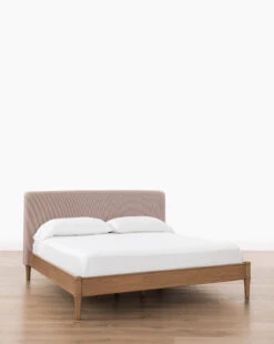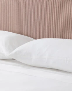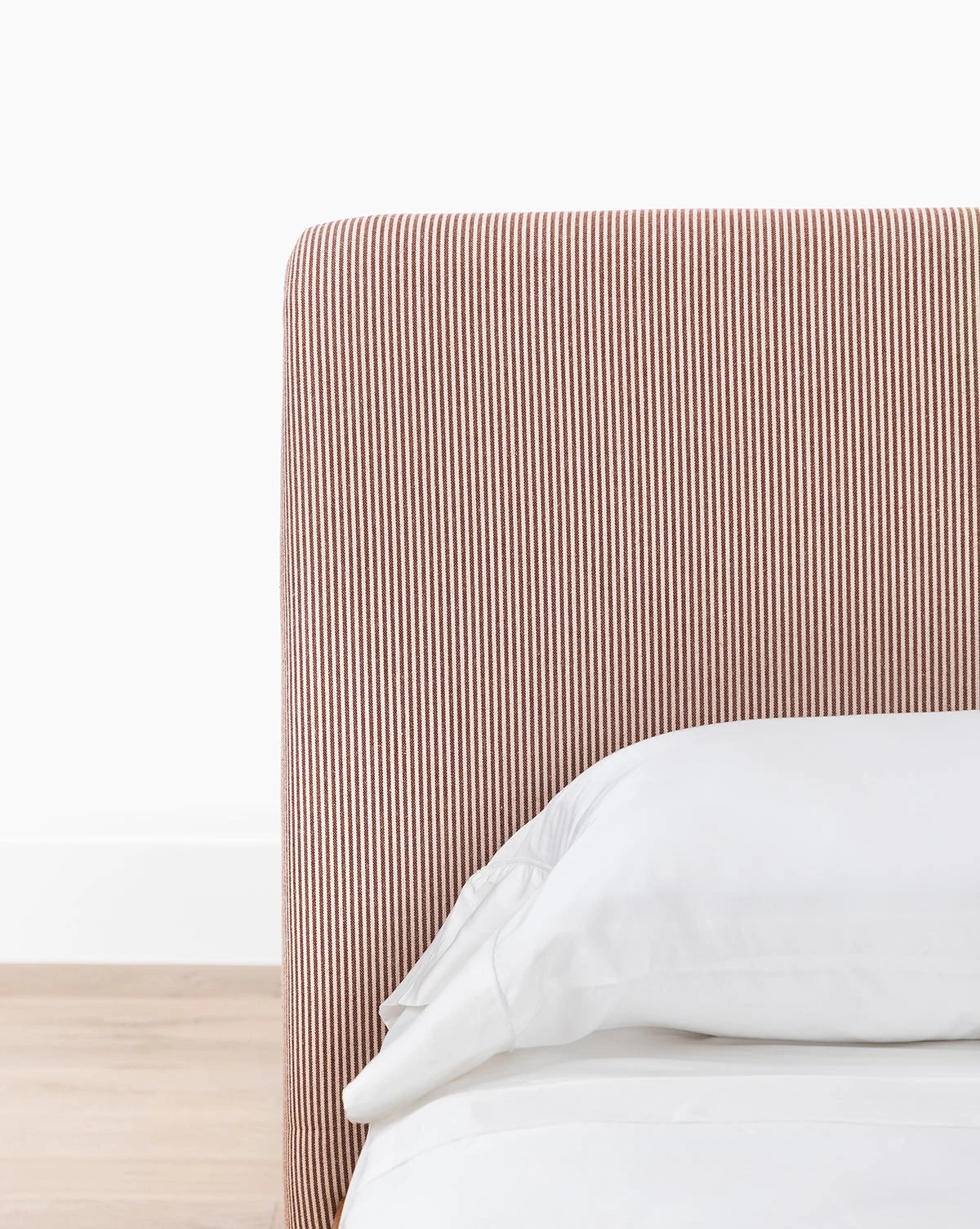 A brown and ivory ticking stripe and rolled pleats across its headboard give the Palladio Bed its character. With the headboard upholstered in coated linen to complement the solid honey oak legs and bring a warm and inviting presence to your bedroom decor.