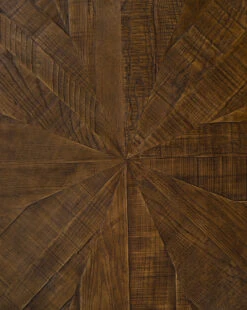 Its simple form is offset with dark brown oak strips, cut in a unique starburst pattern on top. Framed by a lightly distressed brass ring and ebony stained sides, we love with how all these elements come together.
