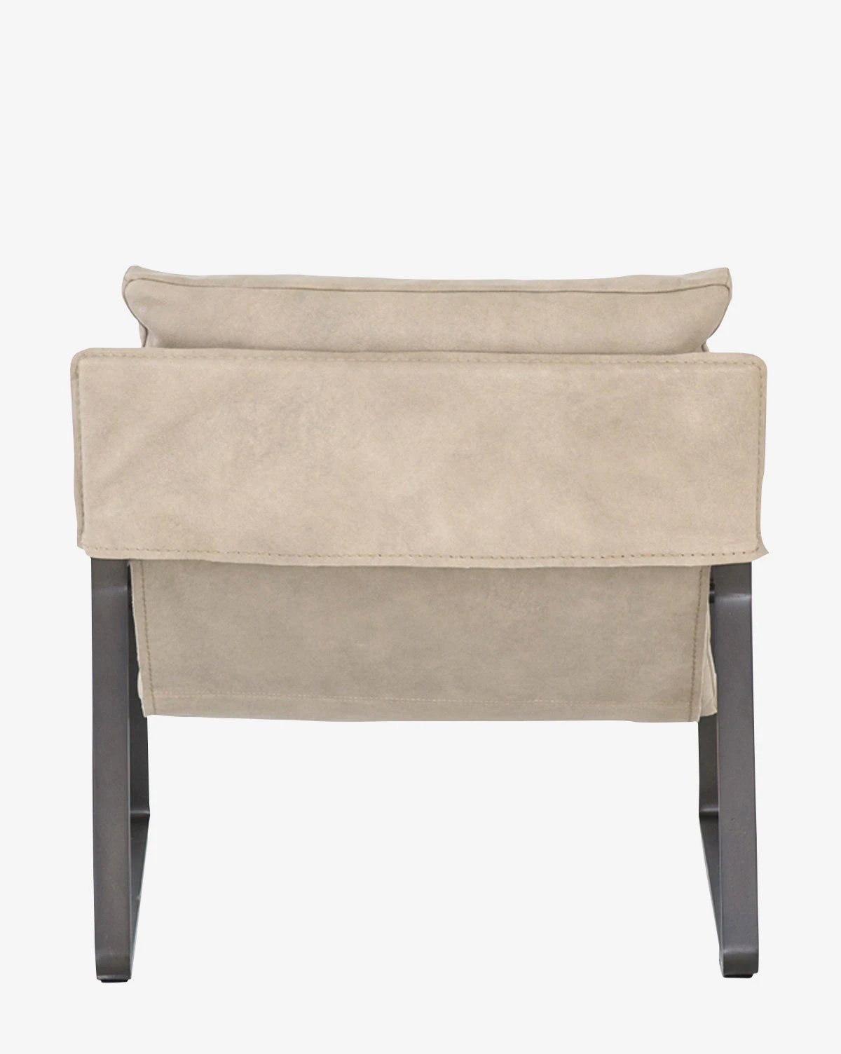 The Peyton Chair’s sling-style seat is outfitted with thick cushions for added comfort and a laid-back feel. With a choice of smooth natural suede or rich tobacco leather, this chair is finished with a gunmetal iron frame, enhancing it’s form and your space with a modern feel.