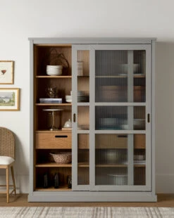 A sleek and innovative painted oak cabinet, the Phillips Cabinet brings a classic meets modern design to your space. Its sliding reeded glass doors open up to functional shelves that are perfect for styling your items. With antique brass handles, this oak cabinet is all about the details.