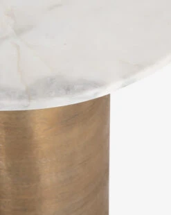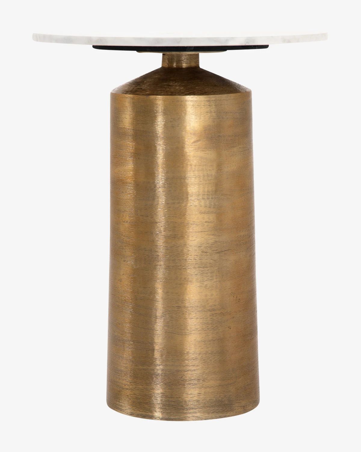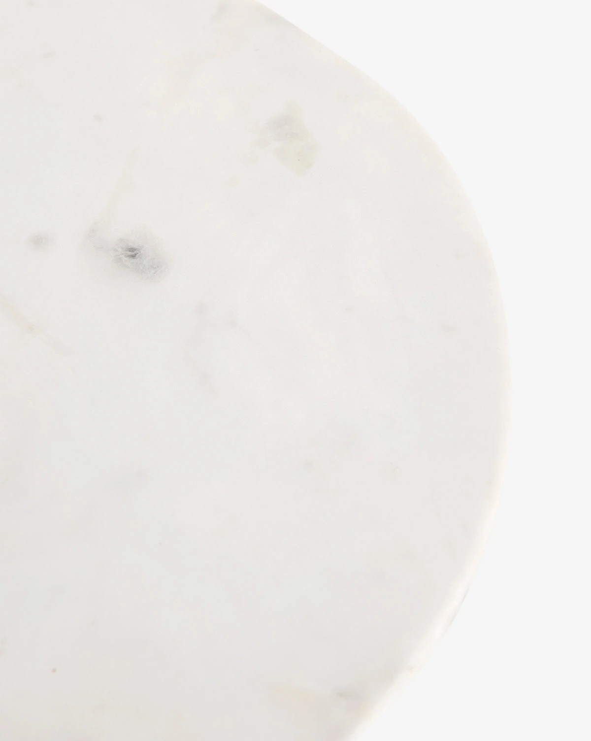 Crafted from a shapely aluminum base and marble top, this dramatically scaled pedestal table is filled with sculptural intrigue. Styled beside your bed in pairs, or holding a light fixture in your living room, the Pia Side Table makes the most of its modern form.
