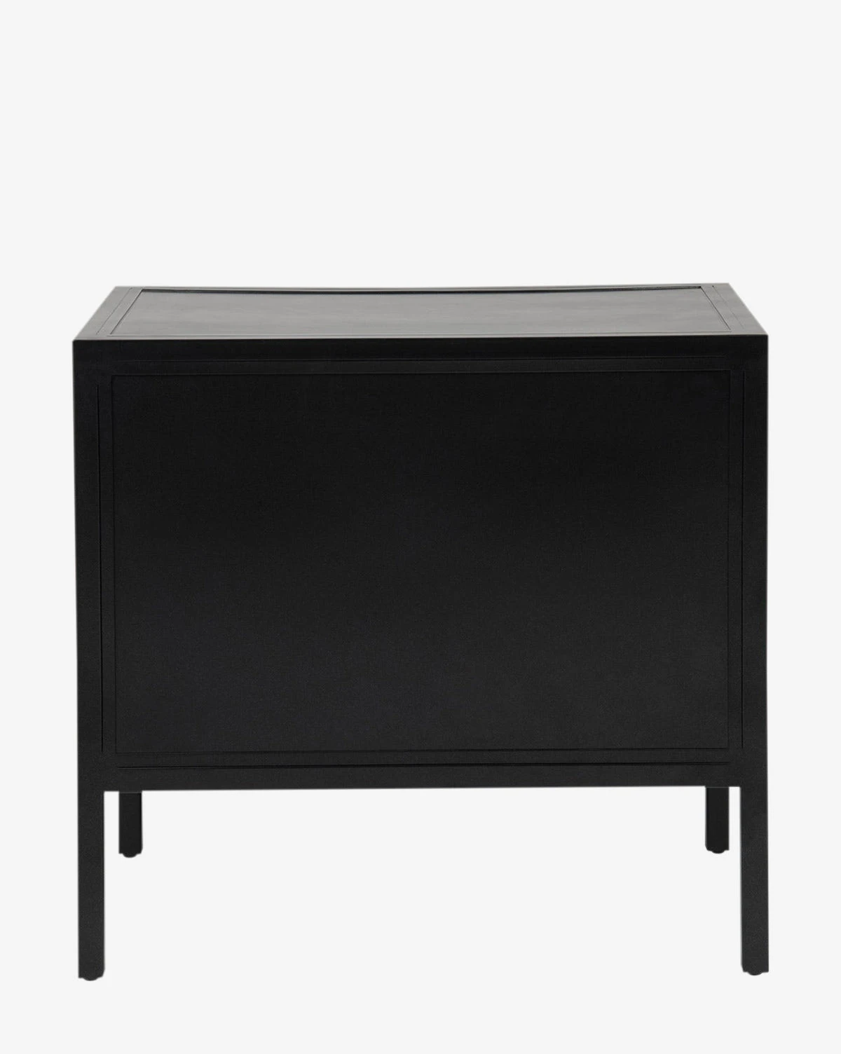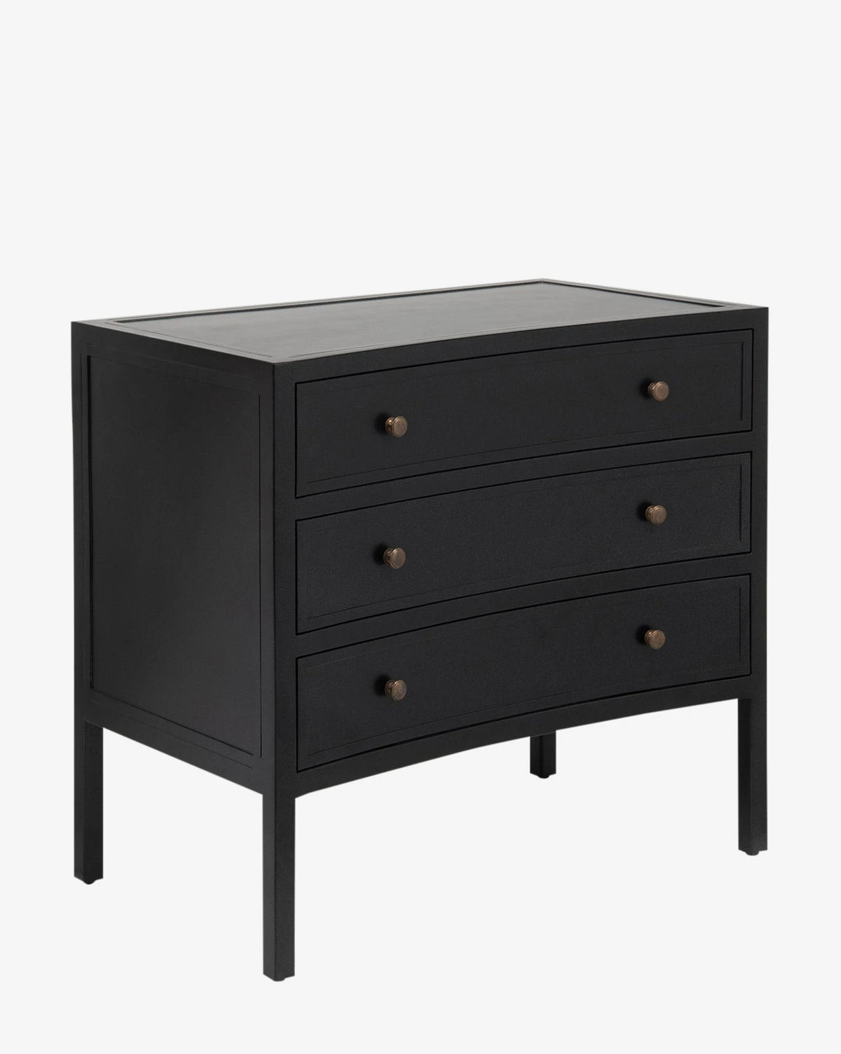 This dresser is an updated take on French campaign furniture; originally designed to make the military march feel as much like home life as possible. Its bowed front, matte black finish, and contrasting brass pulls give it a unique industrial feel that is easy to match with other pieces.