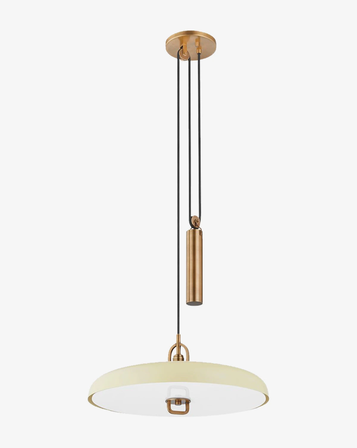 Elegant and geometric, the Plummet Pendant boasts thoughtful craftsmanship with its unique details. The acrylic shade is complemented by a shapely brass pull for visual balance, bringing a beautiful mix of materials and warm light to your space.