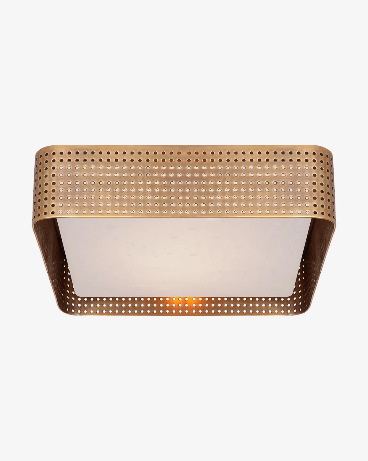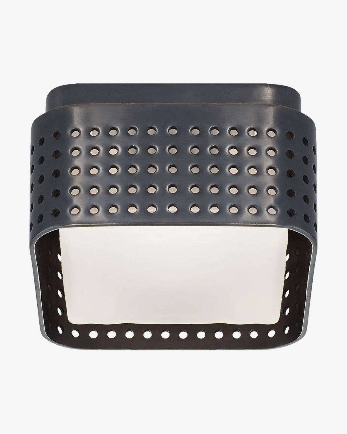 The Precision Flush Mount is an innovative take on classic ceiling lighting. Â Its clouded glass shade is thoughtfully contrasted with a uniformly perforated metal cage is that uniquely diffuses the light.