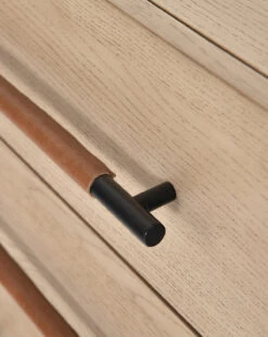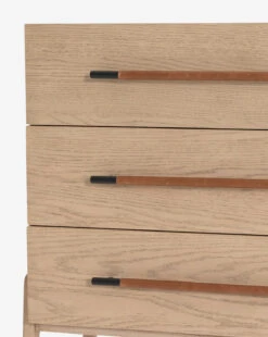 Featuring a stunning material mix, the Ralston 6-Drawer Dresser brings both form and function to your bedroom design. Crafted with an oak frame, this dresser is finished with iron hardware wrapped in tan top-grain leather creating a sophisticated look and feel.