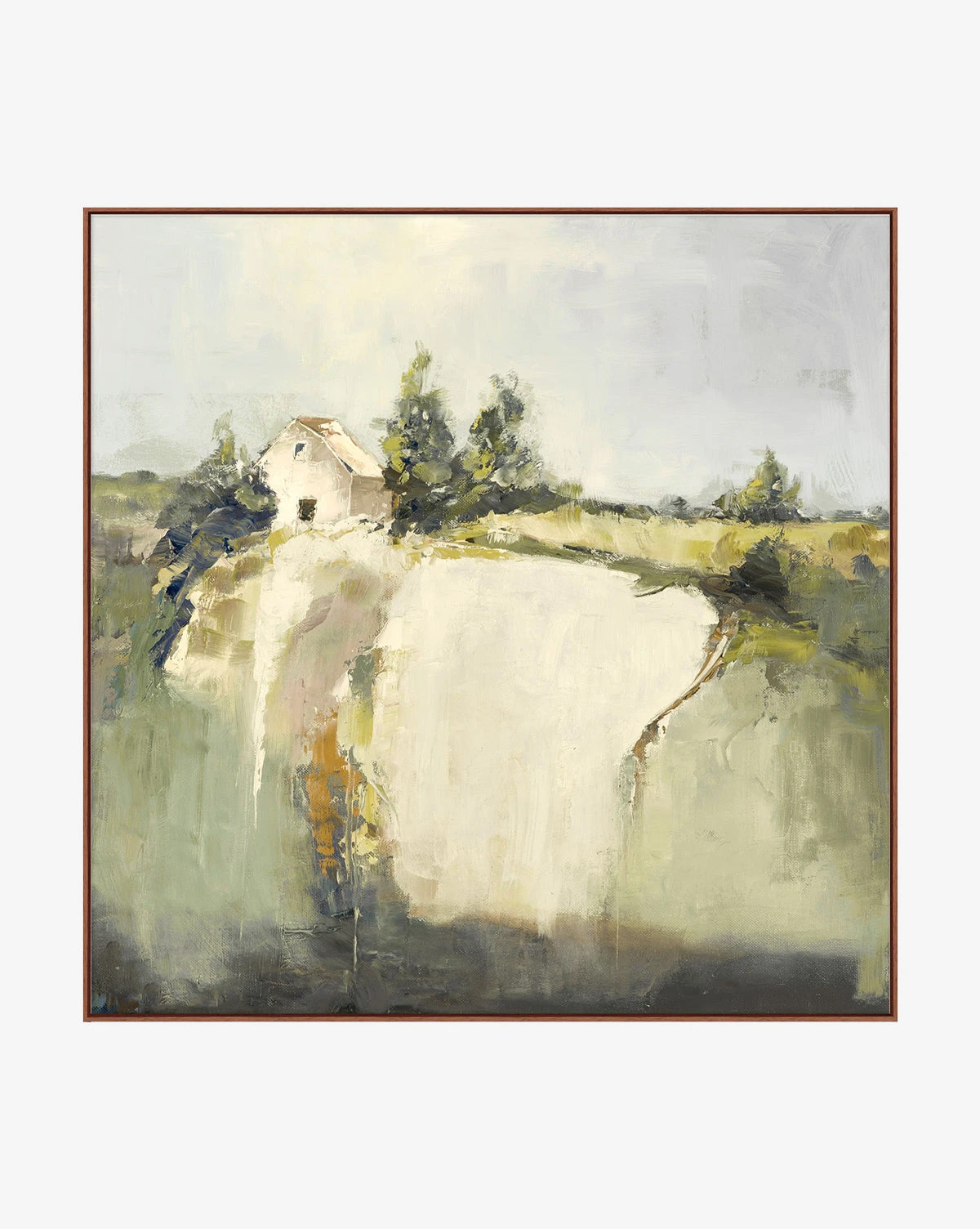 Whimsically romantic, Remote Countryside has a washed look that is complemented by a soft palette of greens and beige. Its composition directs the eye toward the small cottage perched on the hillside โ a call to simplicity. Artist enhanced, Remote Countryside is framed in walnut wood for a museum-quality feel.