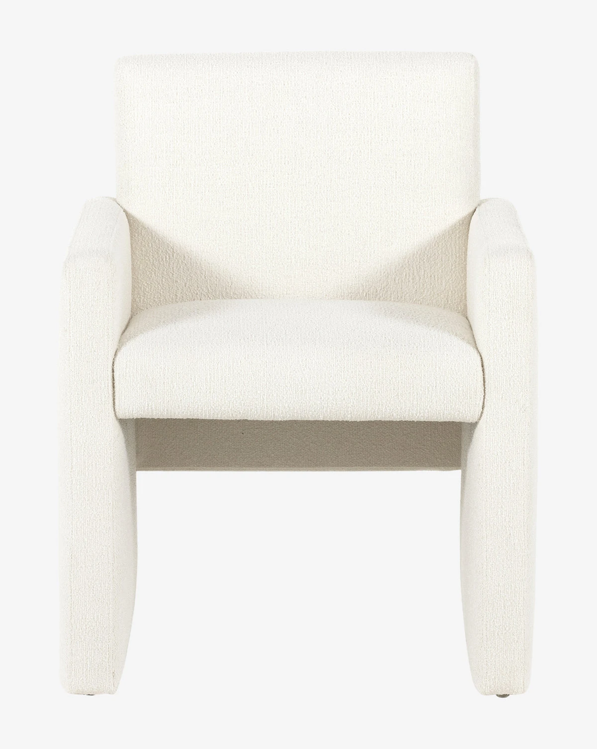 Shapely and bright, the Renzo Chair is upholstered in a cream high-performance fabric. Its components are uniquely modern and scaled in a way that creates depth and dimension. Thoughtfully designed, the chair brings subtle texture to the dining room with its elements of refined comfort.