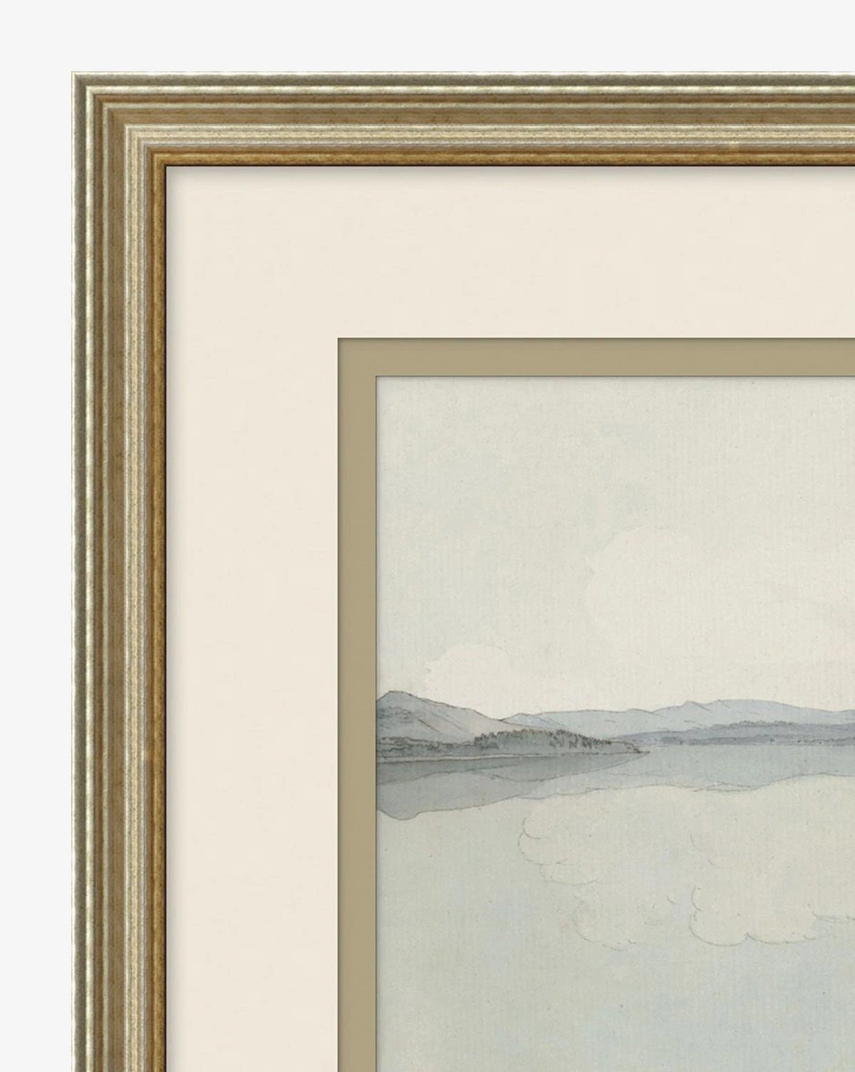 Creating depth with layered tones, Reposeful Lake is contemplative and soft. Giclee printed on matte paper and mounted on double mats, the piece is finished with reverse bevels and an antique silver frame for the museum-quality treatment.