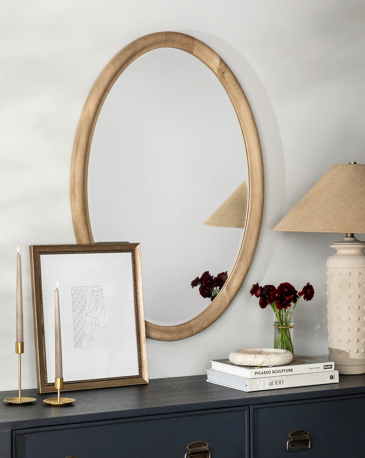 With softly rounded edges and a frame of natural oak, the Reta Oval Wood Mirror has a gentle yet pronounced presence that gives any space a touch of light and dimension. Its rounded edges and neutral finish emphasize its romantic feel, effortlessly creating a subdued statement in the home.