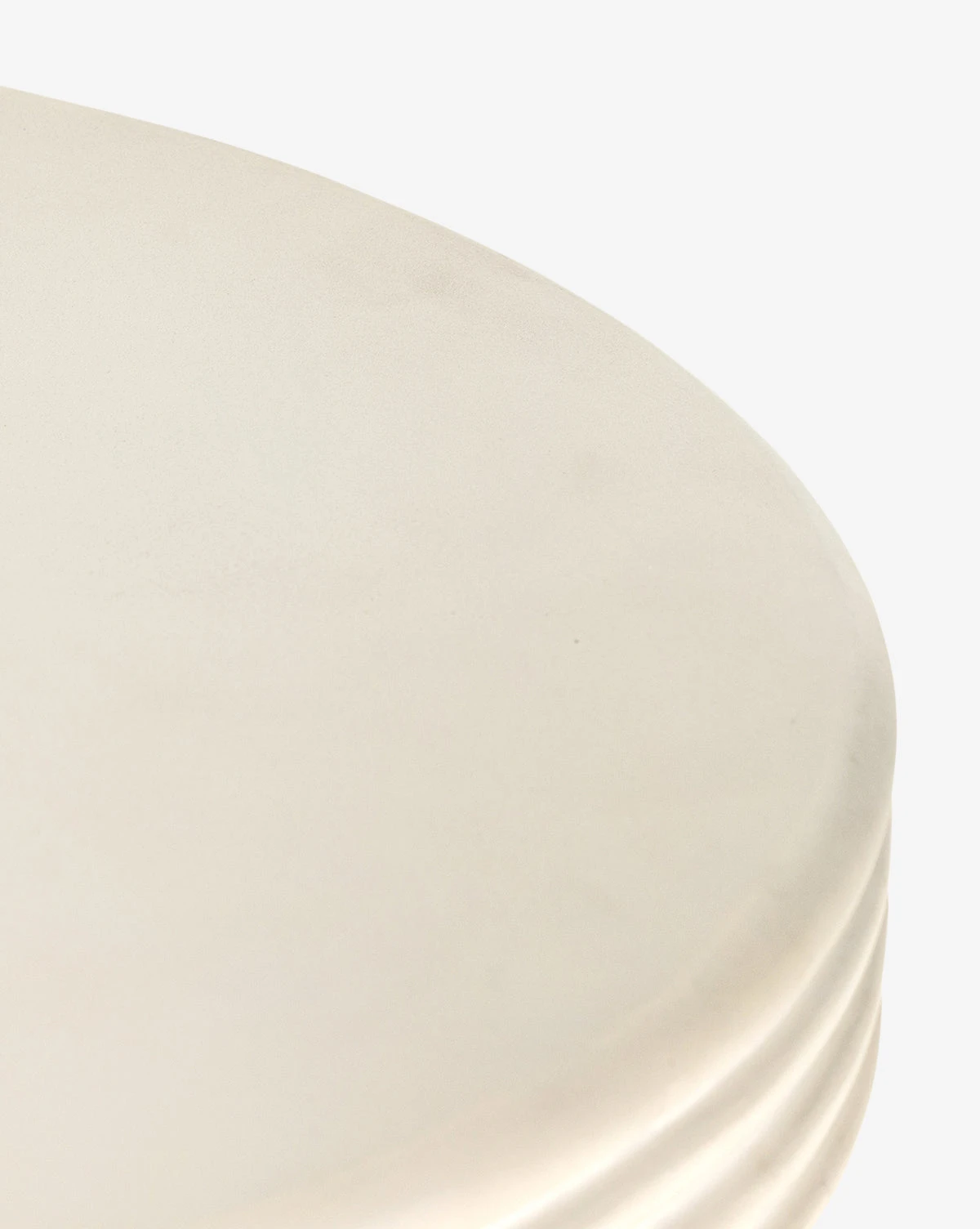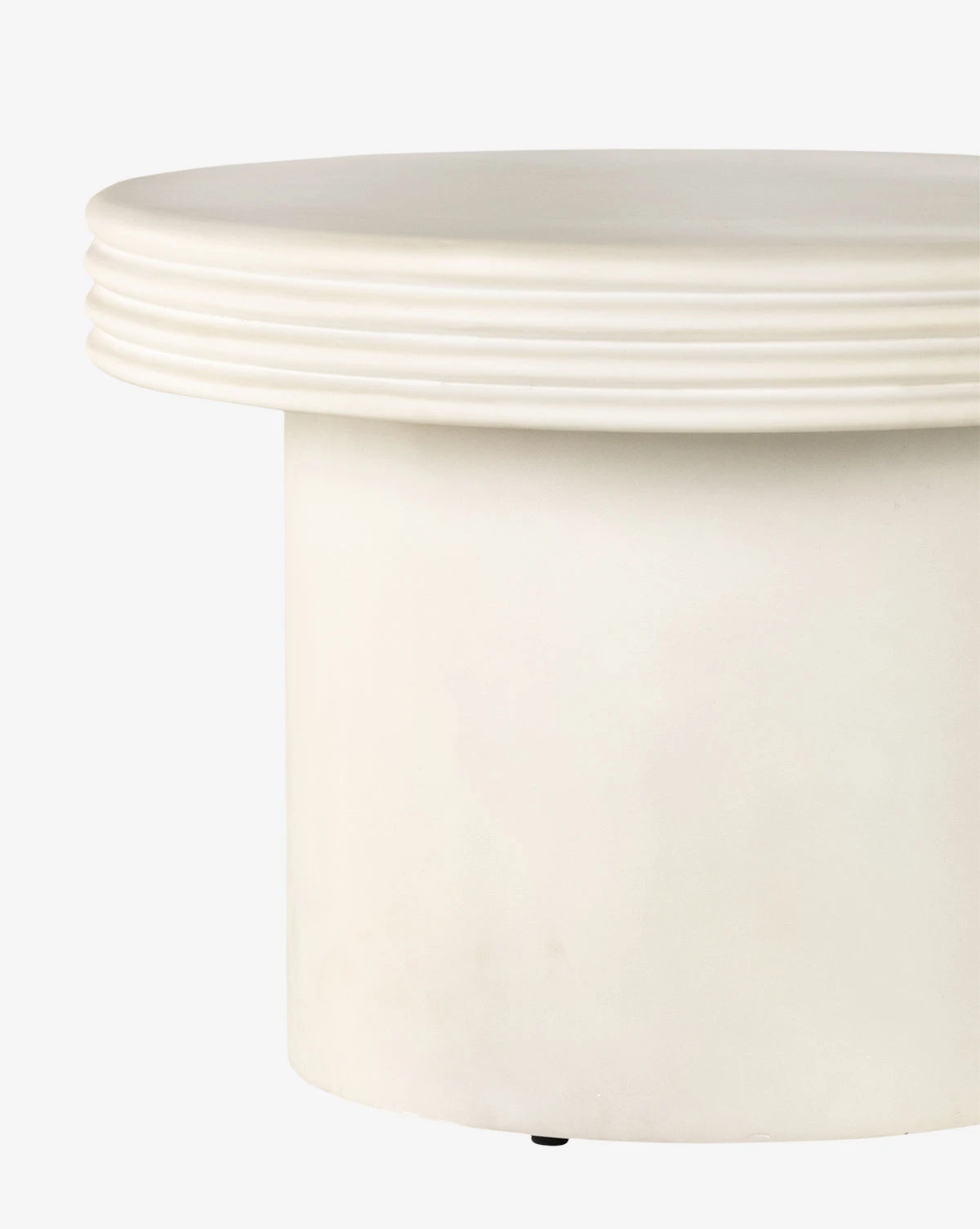 Sculptural and dramatic, the Riah End Table brings its simple structure and bold features to your styling, whether indoors or outdoors. Made from concrete in a white finish, the ribbed edging on the tabletop adds subtle dimension to the cylindrical base.