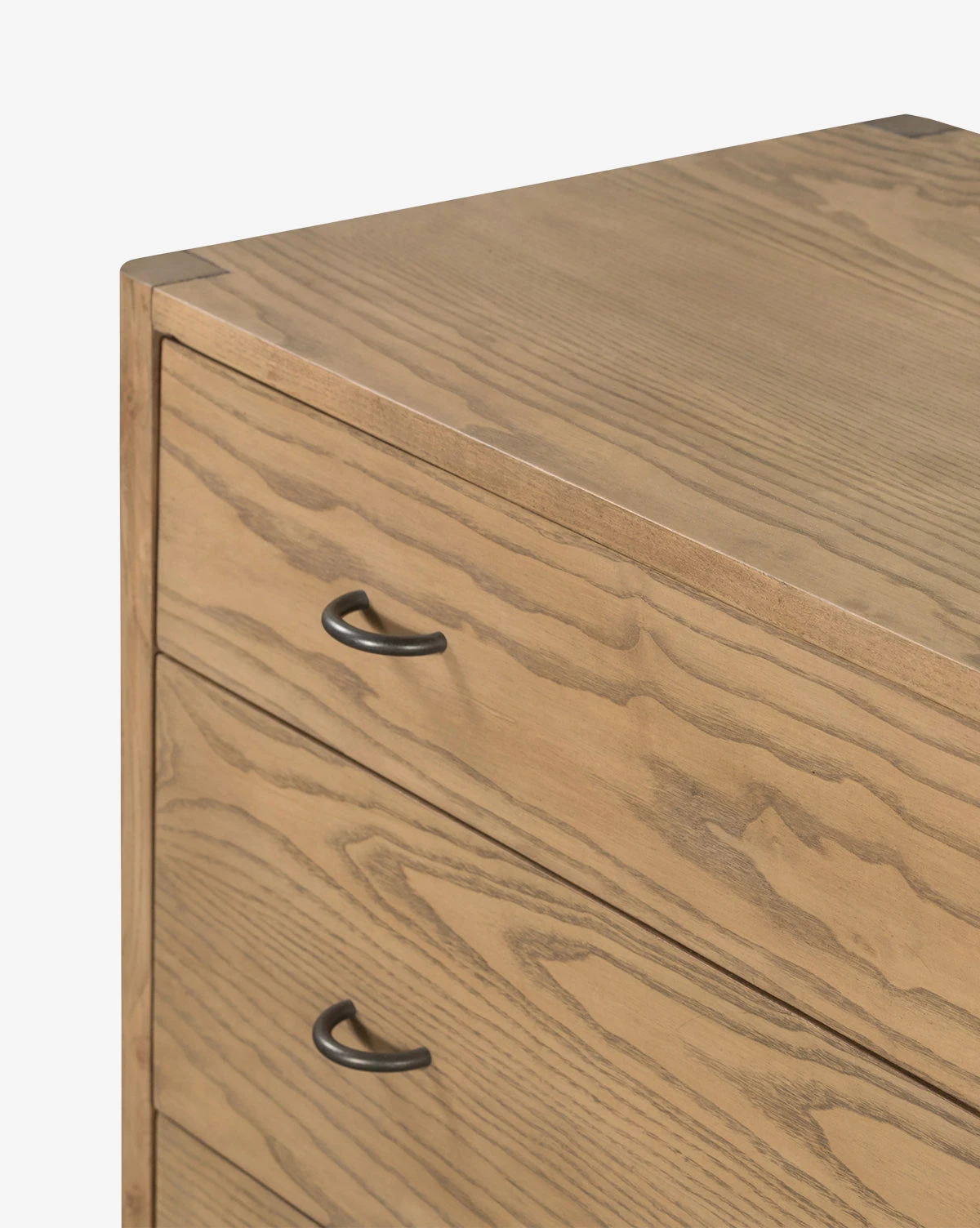 Crafted from solid ash, the Sequoia Dresser is inspired by Danish design. Its subtle details elevate the simple presence of this dresser, with the unique iron drawer pulls and the stretcher-style bottom shelf made from woven paper cord. Its six spacious drawers allow for elegant functionality in your bedroom decor.