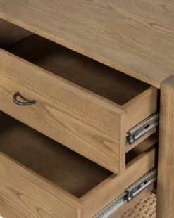 Crafted from solid ash, the Sequoia Nightstand is inspired by Danish design. Its subtle details elevate the simple presence of this nightstand, with the unique iron drawer pulls and the stretcher-style bottom shelf made from woven paper cord. Its two spacious drawers allow for elegant functionality in your bedroom decor.