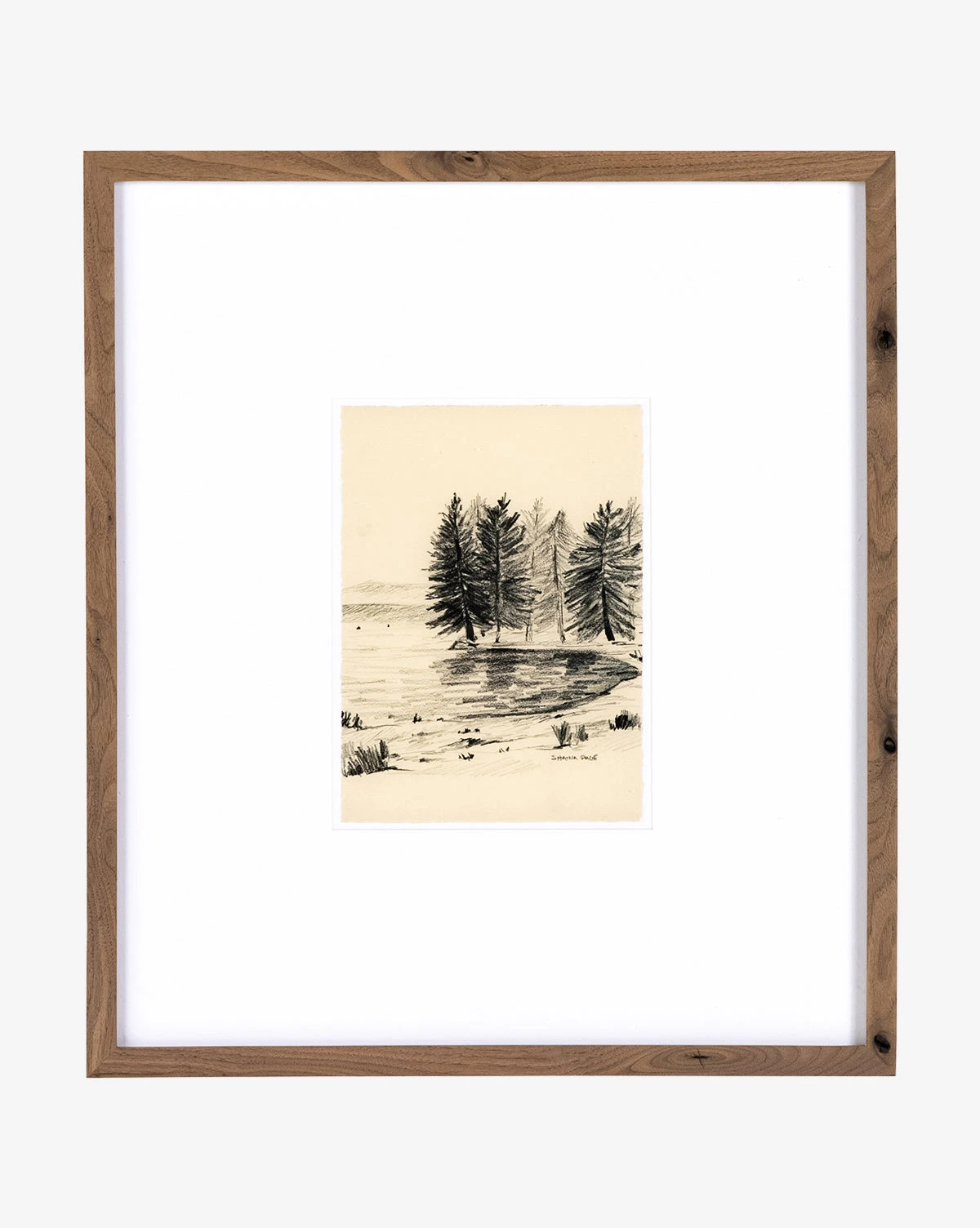 Sketched with expressive shading and lines, Serene Scenery I has a warm and inviting feel. Its composition features stalwart pines along the coast of a majestic body of water, highlighting the simultaneous strength and softness of nature. Framed in rustic walnut, Serene Scenery I has an elevated, museum-quality look.