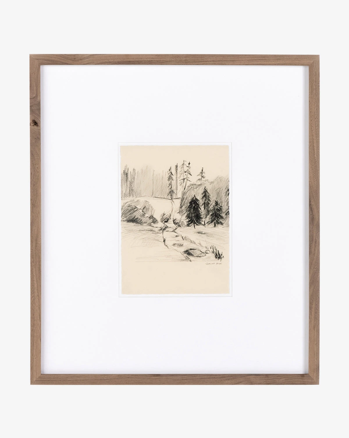 Sketched with expressive shading and lines, Serene Scenery II has a warm and inviting feel. Its composition features stalwart pines along the course of a small stream, highlighting the simultaneous strength and softness of nature. Framed in rustic walnut, Serene Scenery II has an elevated, museum-quality look.