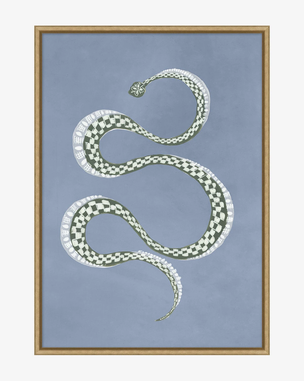 A colorful depiction of a snake, Serpent I is captivating and expressive, reminiscent of imaginative illustrations. Framed within a wood frame with a scaled texture gold finish, the piece is a charming accent to any children’s room. Â
