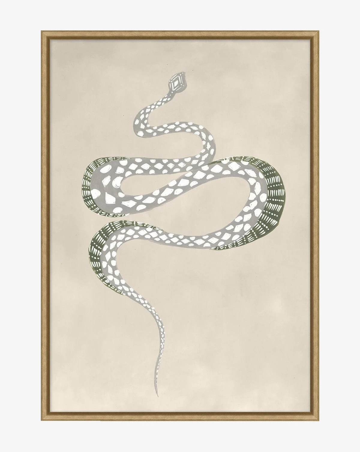A colorful depiction of a snake, Serpent II is captivating and expressive, reminiscent of imaginative illustrations. Framed within a wood frame with a scaled texture gold finish, the piece is a charming accent to any children’s room.Â