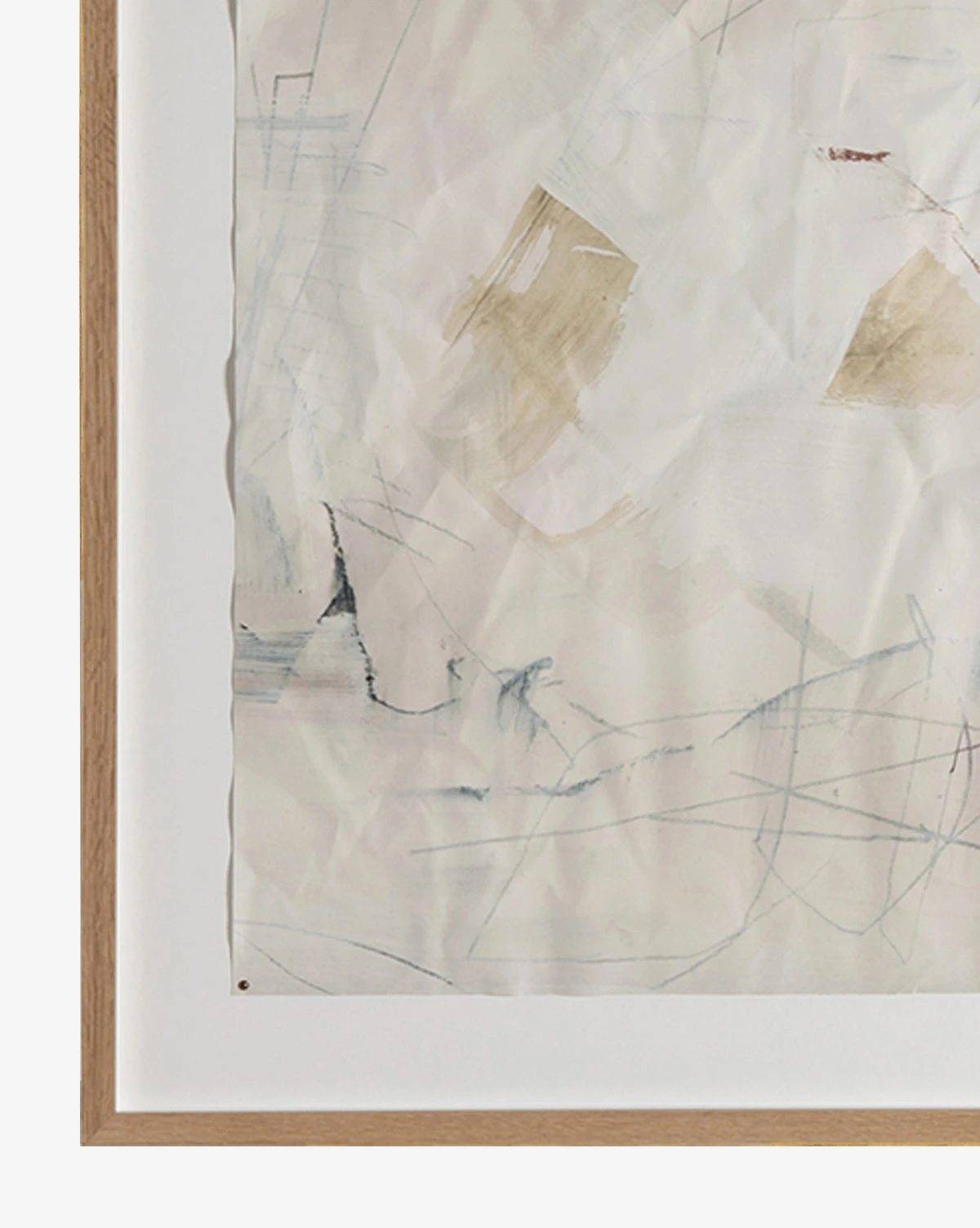 Abstract and subtle, Shapes & Lines is a textural art piece presented as a print on canvas that is crinkled and loosely floated with brass pins. Displayed within a white oak frame, the artwork brings gallery-quality materials to your decor.