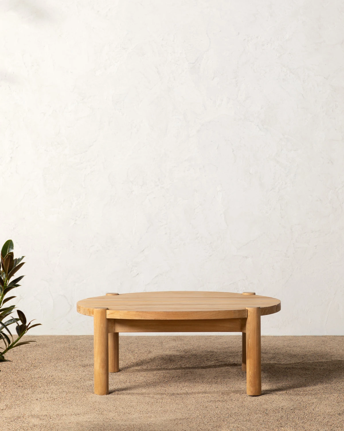 Crafted from teak wood, our Simeon Outdoor Coffee Table offers both aesthetic and functionality to outdoor lounging. Designed with teak panels in a circular tabletop and supported by thin cylindrical teak legs, this coffee table is both inviting and organic.