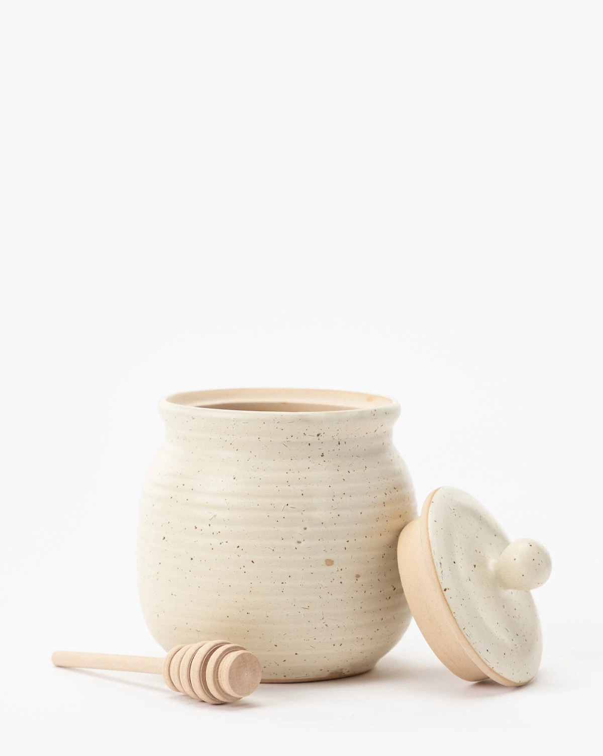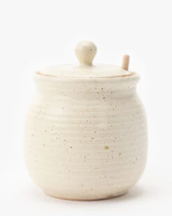 Crafted from stoneware and finished with a reactive glaze, the Speckled Honey Jar adds the perfect touch of sweetness to your kitchen. Its rich cream finish is freckled with beige and dark browns, and the jar itself is ribbed with horizontal lines giving the piece extra character and interest.