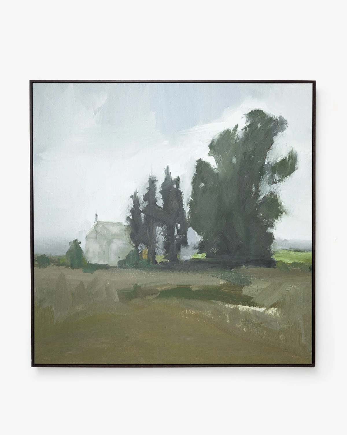 A serene open landscape comes to life with expressive brushwork in Spring Skies. With museum-quality materials, this colorful piece is a giclee print on gallery-wrapped canvas within an espresso wood frame.