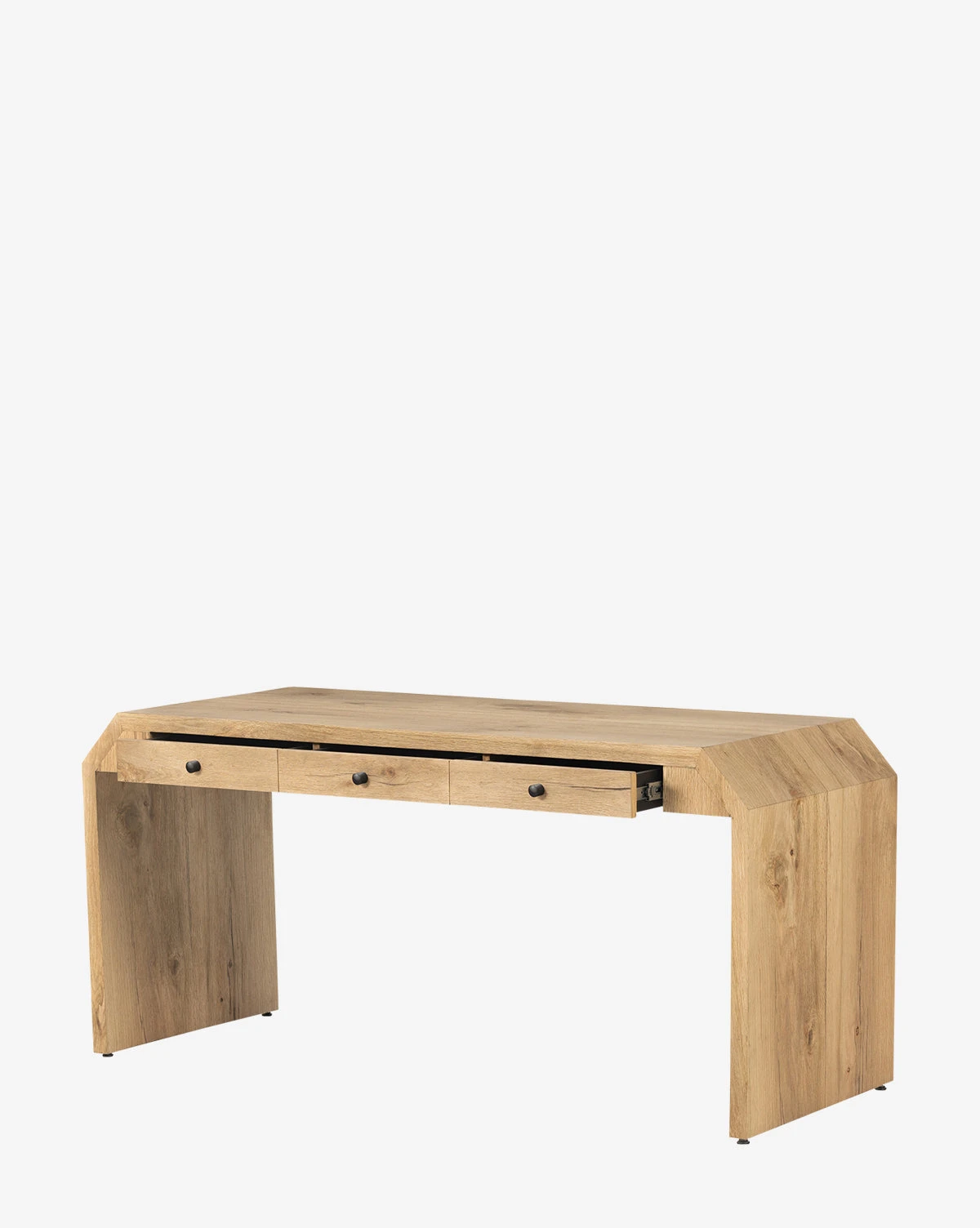 Geometric and intricate, the Stellan Desk is made with a thick oak veneer and small iron details. The natural graining on the surface of the desk gives an organic feel to any office, while the unique structure adds modern sophistication. With three drawers and a wide surface, the desk is a home office essential.