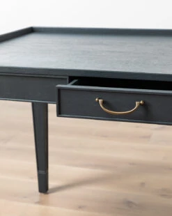 With inset panel details, our Stratford Desk brings an updated traditional feel to your home office. Its dark slate matte finish is sophisticated and slightly moody while its sleek brass drawer pulls are both elegant and practical.