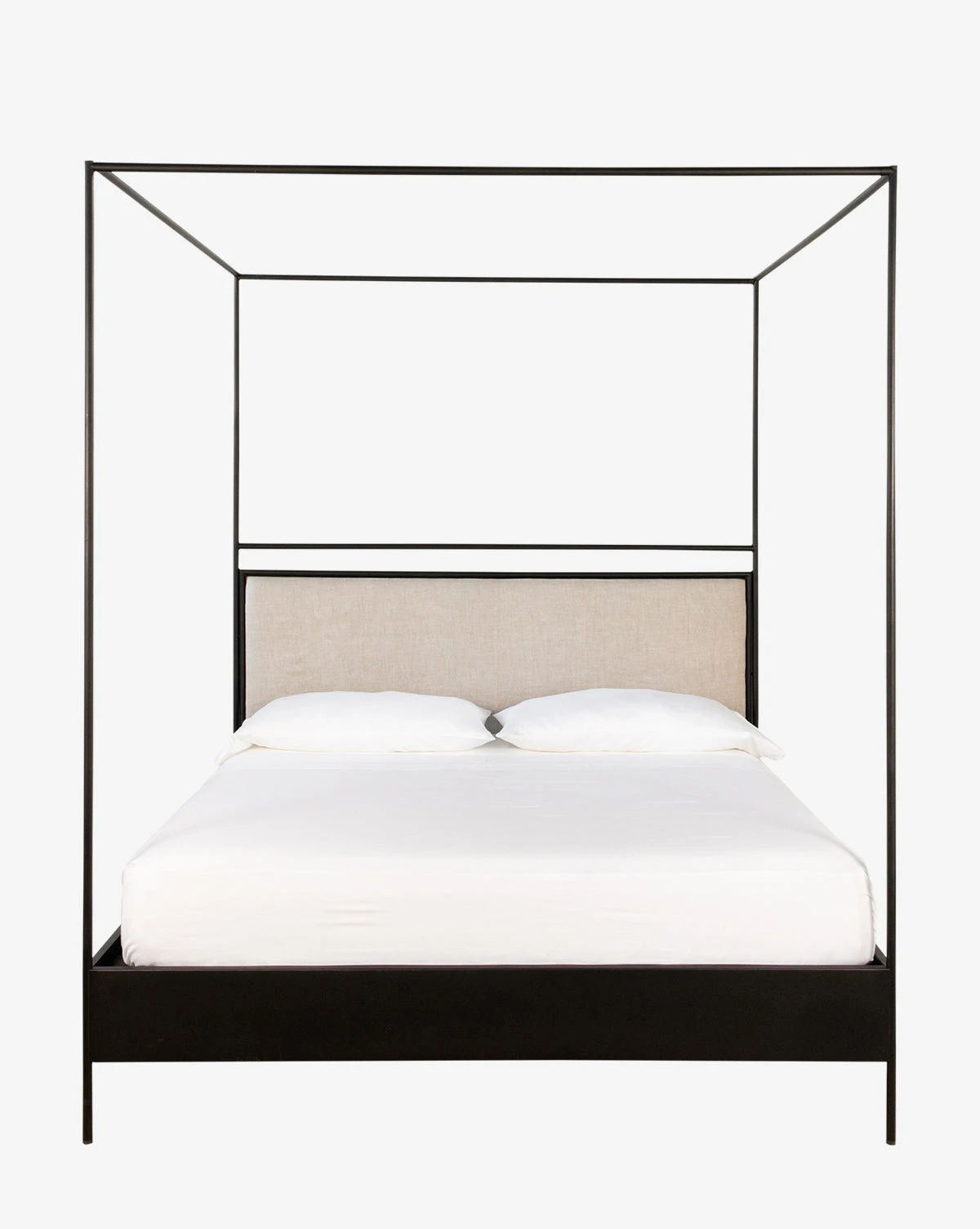 With a modern take on a classic design, our Sutherland Canopy Bed makes a grand statement in your bedroom. Featuring a sophisticated dark finish, its unique construction combines dimension with traditional style from the metal frame to the linen upholstered headboard.