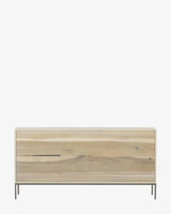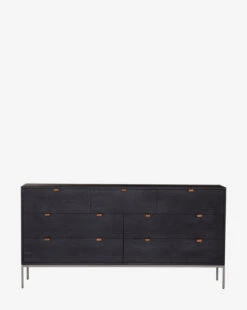 Crafted from solid poplar with detailed dovetail joinery, the Thorton Dresser adds style to your bedroom without sacrificing storage. In a either a black or white-washed finish contrasted with metal-secured toffee leather pulls and slender iron legs, this dresser gives mid-century design a material-driven update.